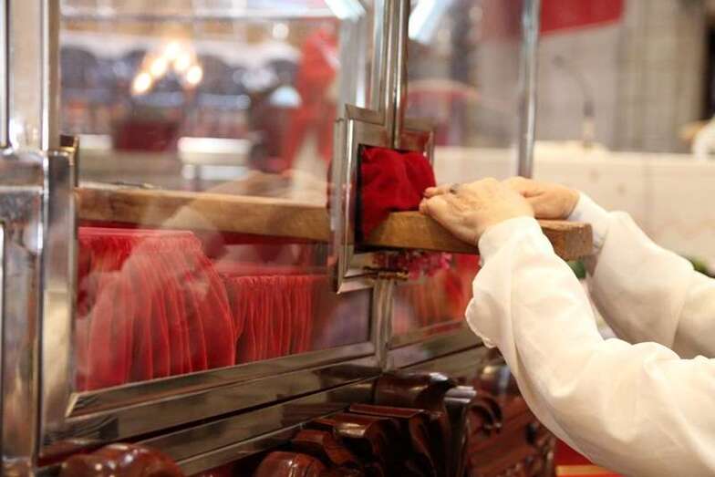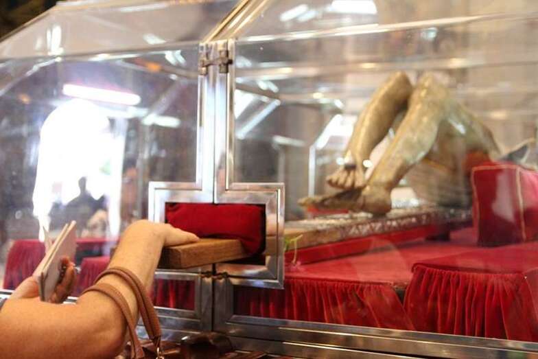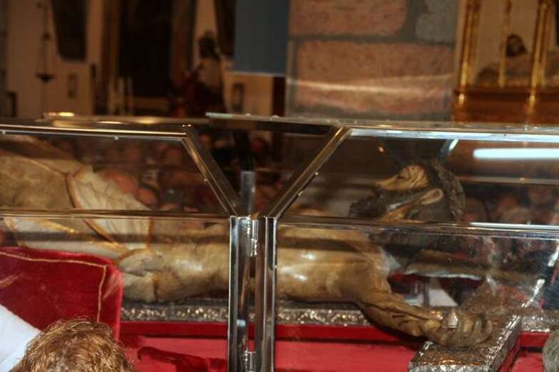 Muchísimas personas devotas, fieles a su tradición heredada de sus antepasados, locales y visitantes, se han acercado y acariciando el madero, han acercado flores, velas, recordatorios, rosarios, oraciones, rogativas, promesas, con sus manos y besos han acariciado y sentido la llamada del amigo que en esta ocasión está más cerca que nunca, ante el madero de la cruz y a los pies de su yacente figura después de haber descendido de manos de los voluntarios que lucen con orgullo sobre sus camisetas el lema e imagen del Santo Cristo de Telde.