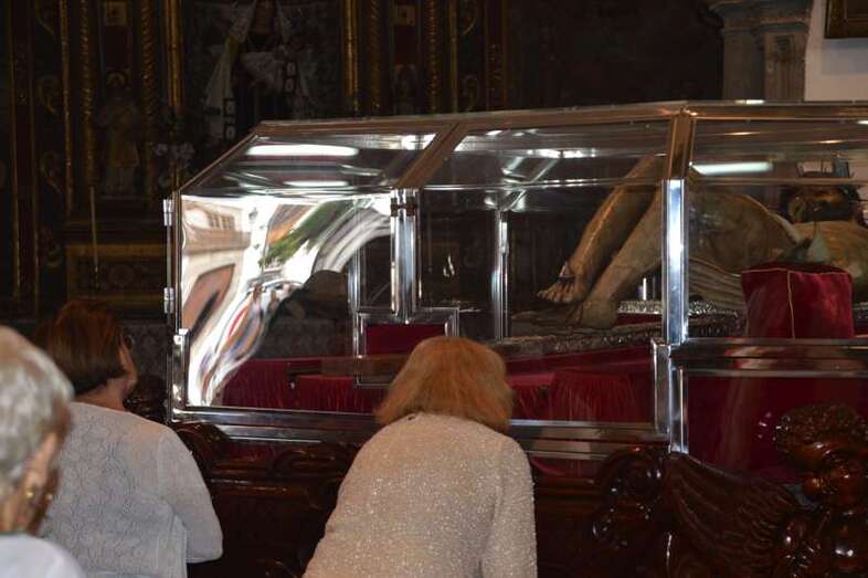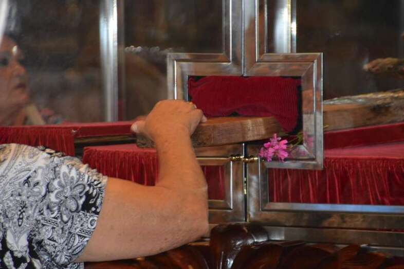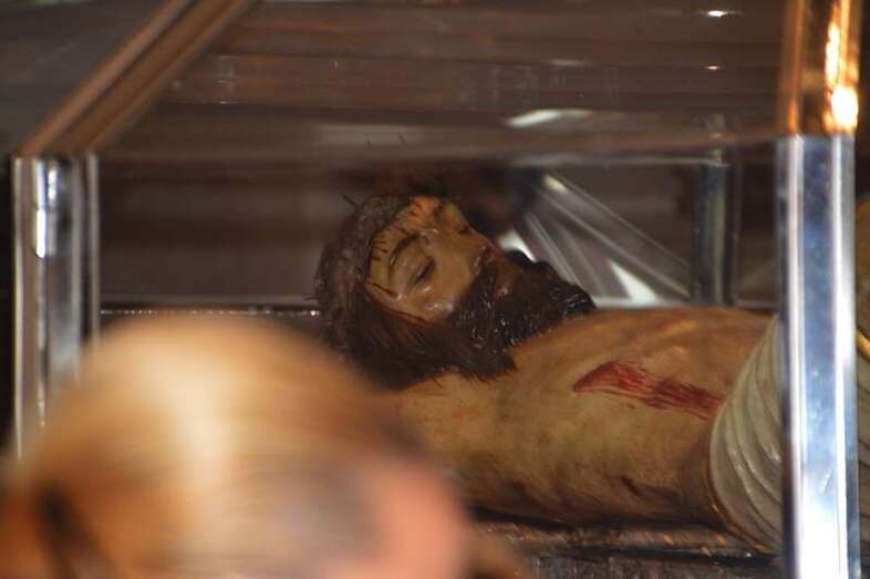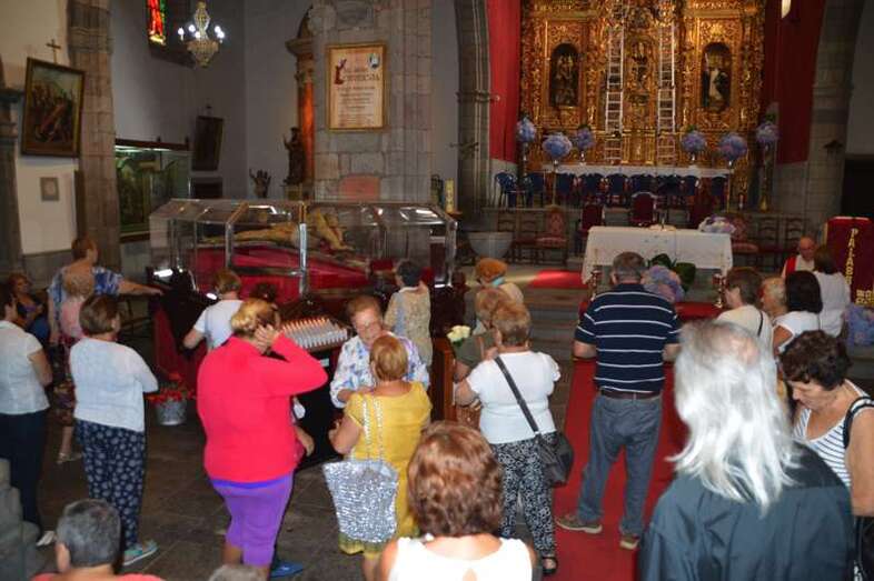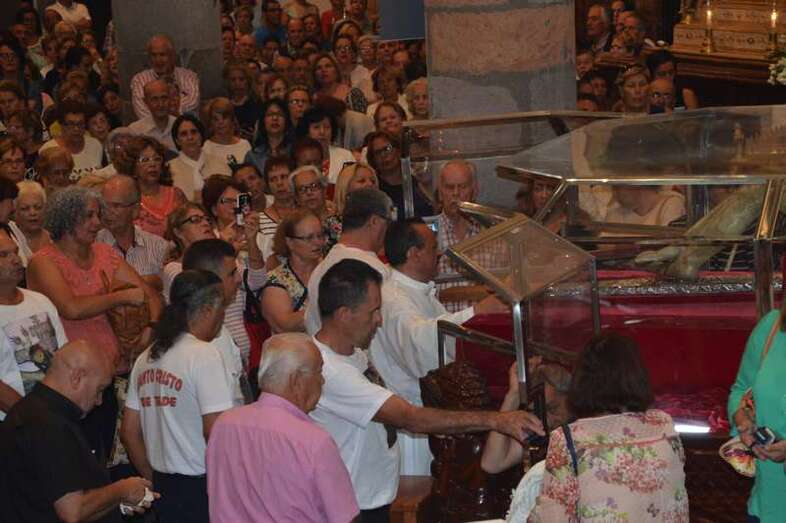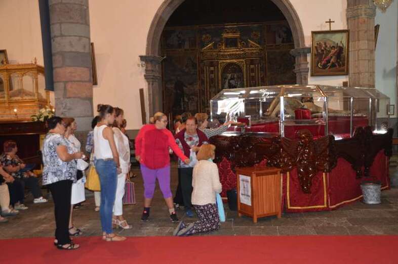 Momentos antes de la subida, los feligreses siguieron cumpliendo un rito centenario despedirán la imagen con la ceremonia del besapiés. A pesar de que antiguamente se dejaba tocar los pies descalzos de la talla, tras su restauración sólo se permite tocar la parte inferior de la cruz, mientras el cuerpo permanece dentro de la urna de cristal de su trono móvil.