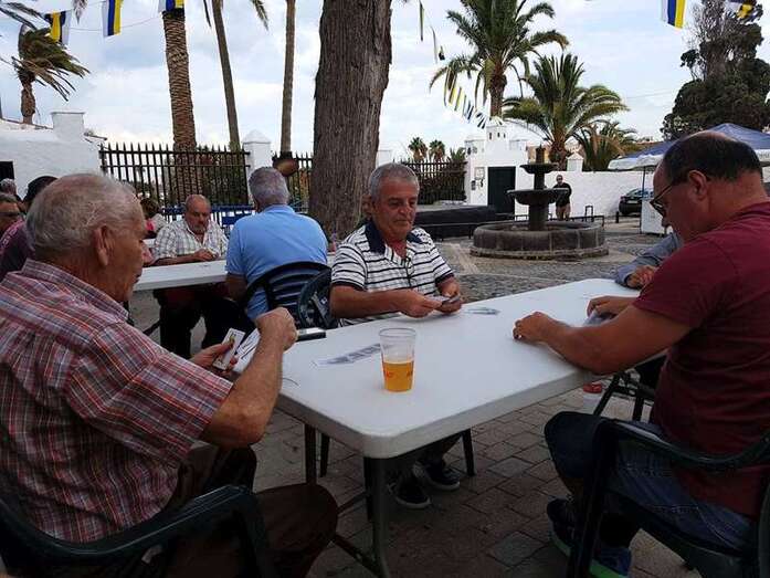 La vistosa y colorida plaza pública del barrio se convirtió ayer lunes en una improvisada sala de juego de zanga en la que, al socaire del prominente pino canario y junto a la fuente que presiden el lugar, se dieron cita hasta cinco equipos, uno de ellos íntegramente femenino.