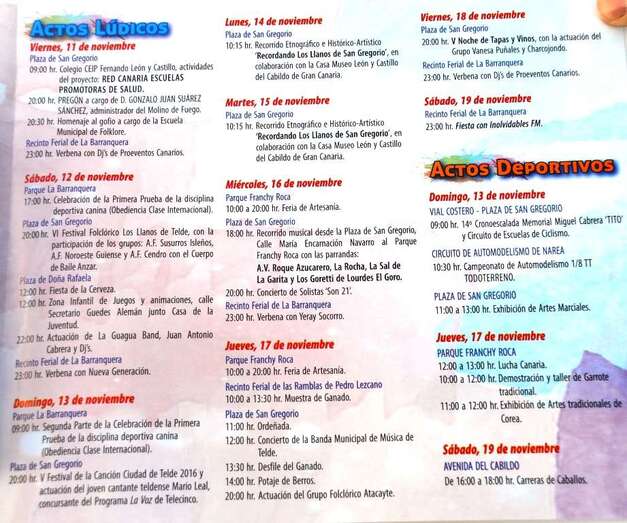 Telde.- El Gobierno de Telde hizo público este mediodía el programa de actos de las Fiestas de San Gregorio Taumaturgo 2016. Serán diez días de celebraciones de lo más variopintas en honor del compatrono de la ciudad que comenzarán este viernes y que se extenderán hasta el próximo 20 de noviembre.