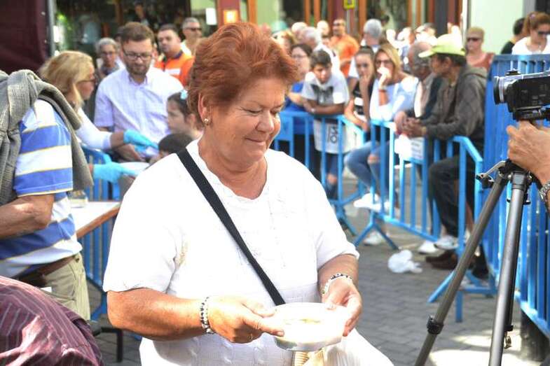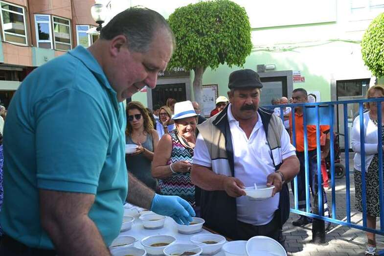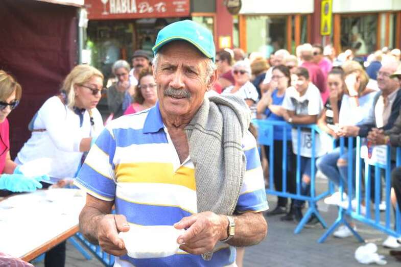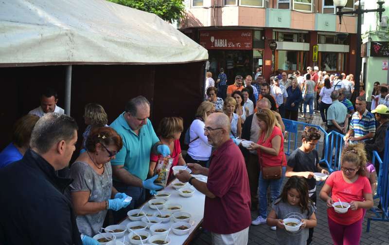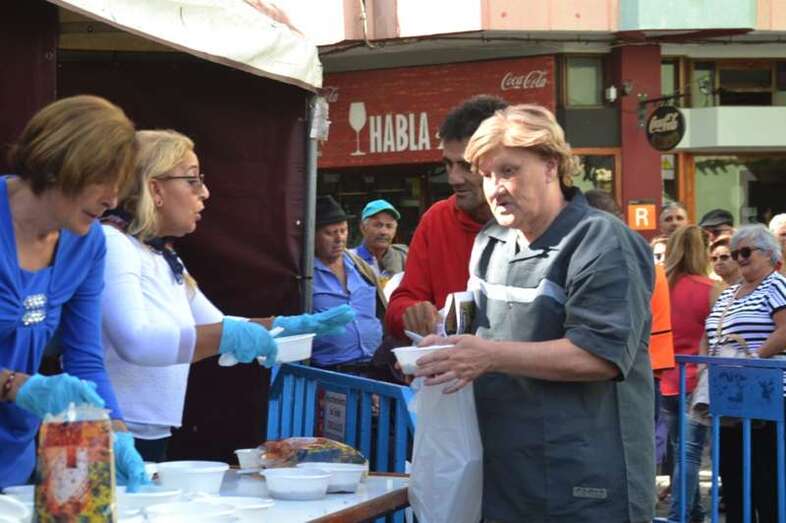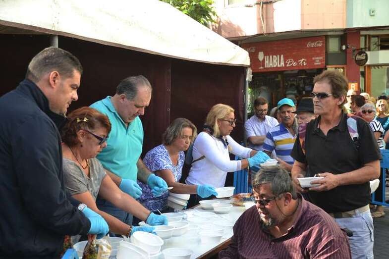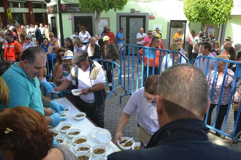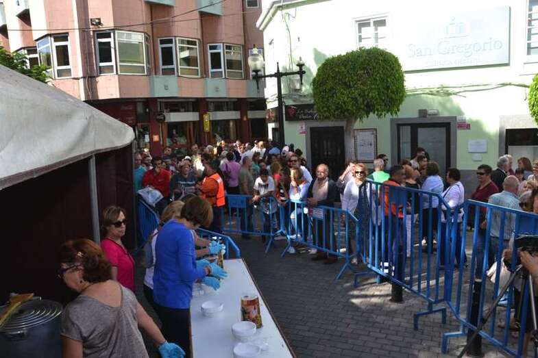 La cola incluso llegaba a mitad de la calle Cervantes. Y con media hora de adelanto sobre el horario previsto en el programa, que fijaba esta degustación a las 14.00, comenzó el reparto de las cerca de 400 raciones de potaje canario debidamente acompañado con un puño de gofio del Molino de Fuego, como manda la tradición en Telde.