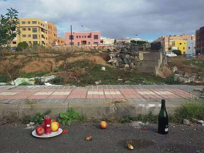 Allí, en la rambla de Pedro Lezcano, junto a una de las parcelas abandonadas, ha aparecido una vela, varias manzanas y una botella que los vecinos sospechan que puedan estar asociados con  este tipo de rituales y ceremonias. La duda está servida.