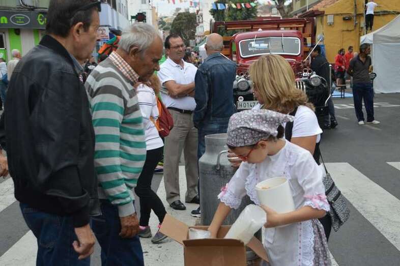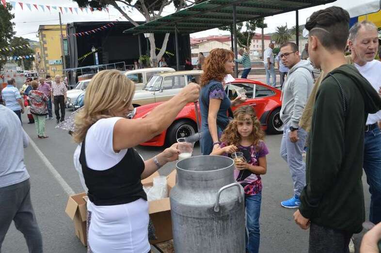 Los asistentes pudieron saborear leche de vaca fresca con un puño de gofio en una degustación que arrancó a las 10.00 horas y duró hasta que se acabaron las existencias en plena calle, flanqueada entre la iglesia y la plaza pública por una  exposición  de una decena de vehículos antiguos a cargo del Club de Automóviles de Coches Clásicos y Antiguos de Telde