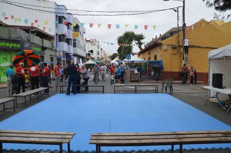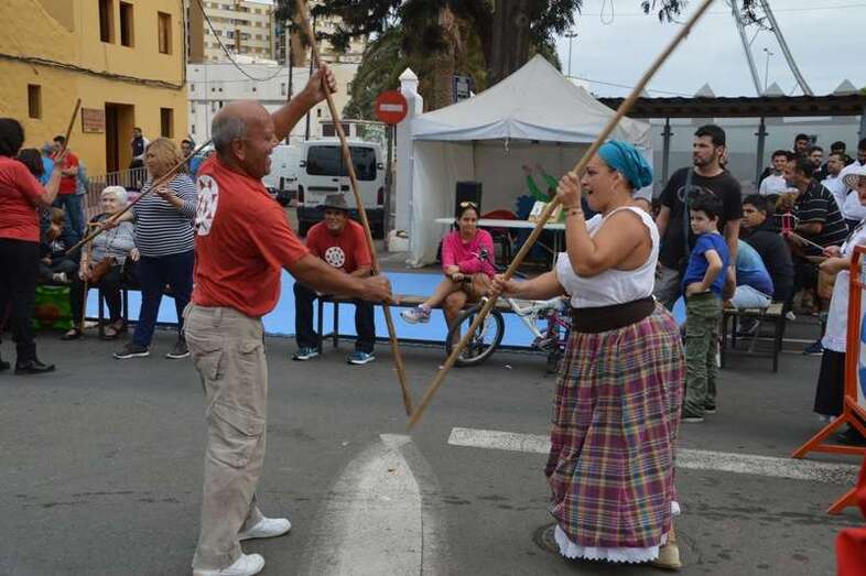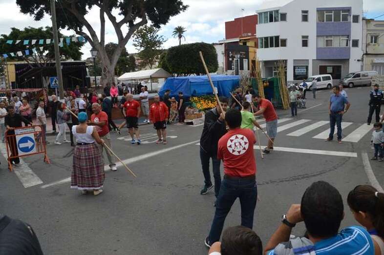 Mientras allí daban vueltas y vueltas a los ingredientes del guiso y preparaban cientos de bocadillos de chorizos,  la vía principal del pueblo, cerrada al tráfico,  se transformó en un improvisado terrero para acoger la demostración de lucha canaria a cargo de dos combinados de los  equipos de base del histórico club teldense Castro Morales, y la exhibición del juego del palo por parte de componentes de la Escuela del Garrote Tradicional Maestro Paquito Santana.