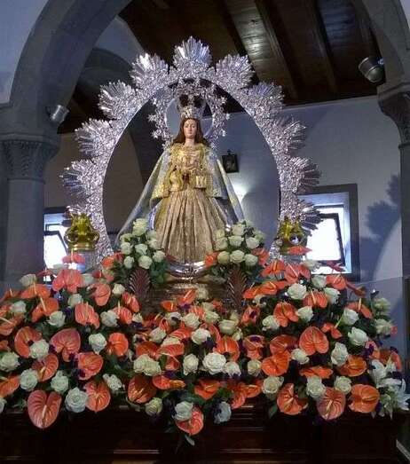 El trono religioso, bellamente engalanado con una decoración floral de anturios rojos y rosas blancas, hizo su aparición por la portada principal de la iglesia a las 13.10 horas para efectuar el recorrido de costumbre. El inicio de la procesión fue festejado con la suelta de globos de colores blanco y celeste y una traca de voladores.