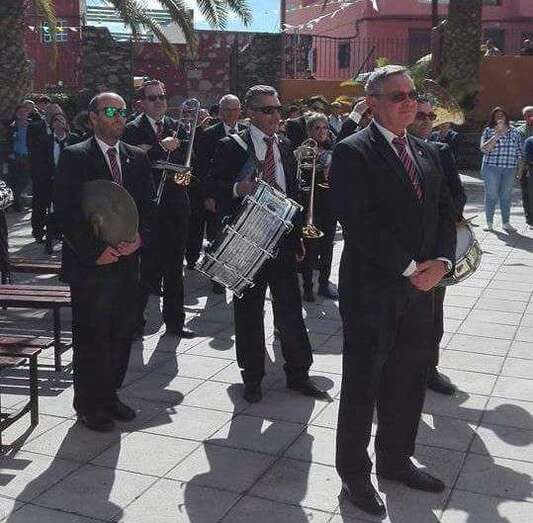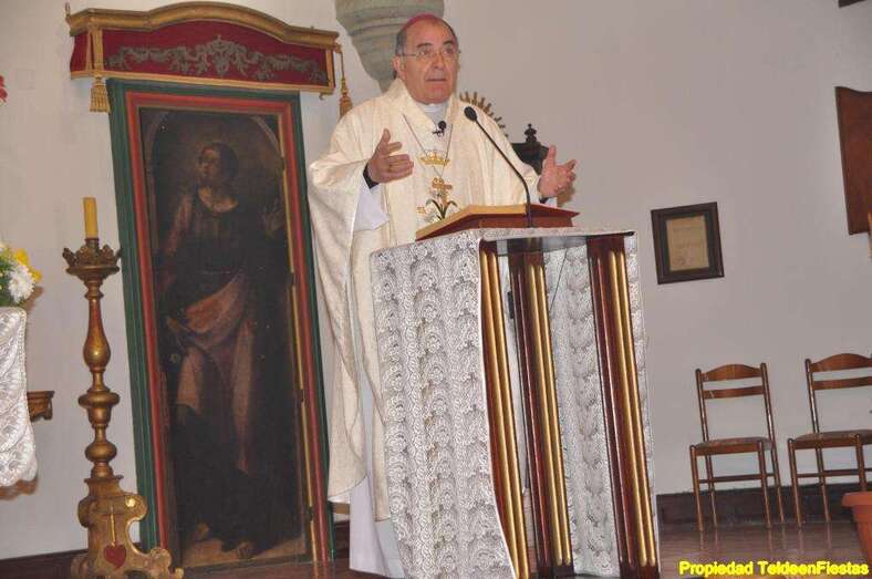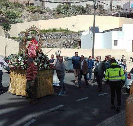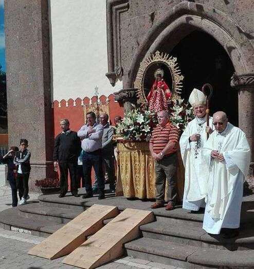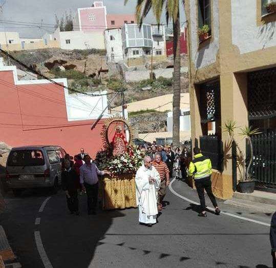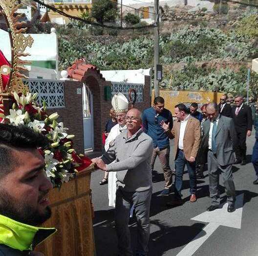 El obispo y el párroco de la zona, Eugenio Peñate, acompañaron todo periplo religioso de más de una hora de duración al que asistieron también un nutrido grupo de feligreses, la Banda Municipal de Música y ediles del Ayuntamiento de Telde.