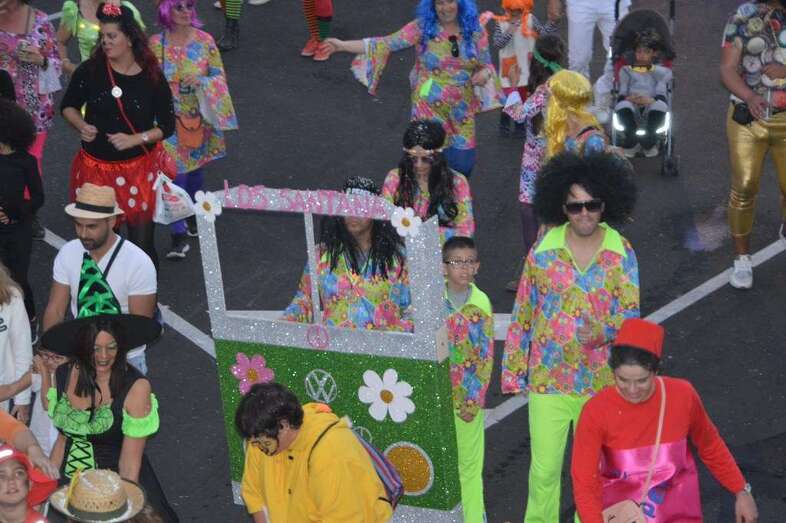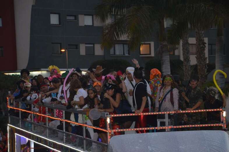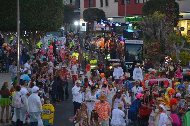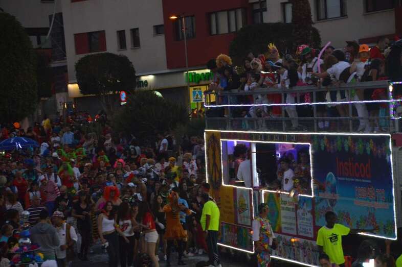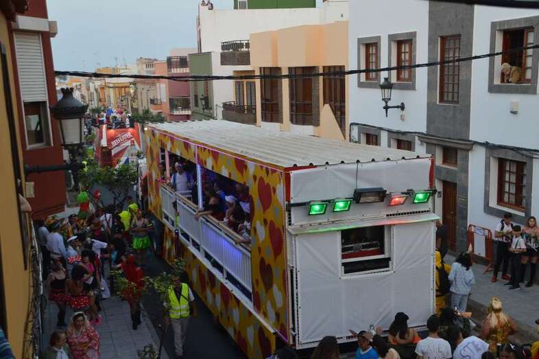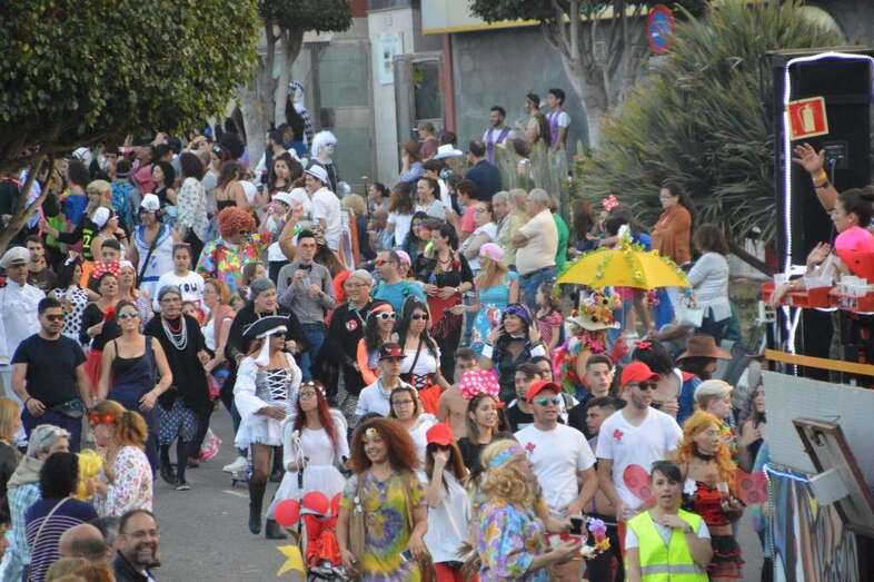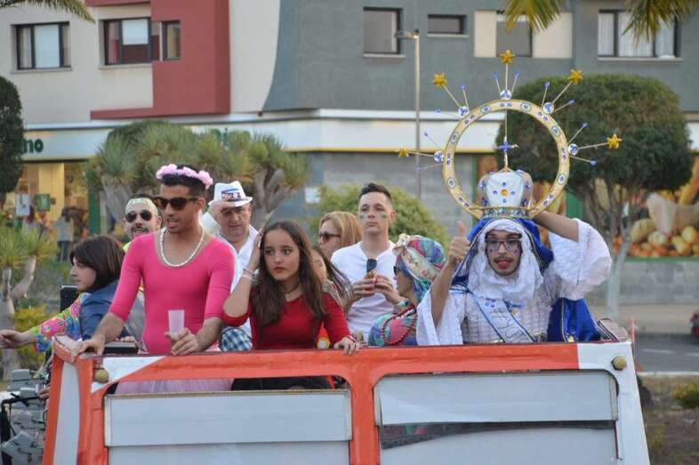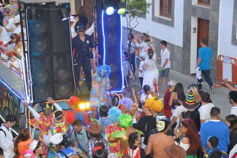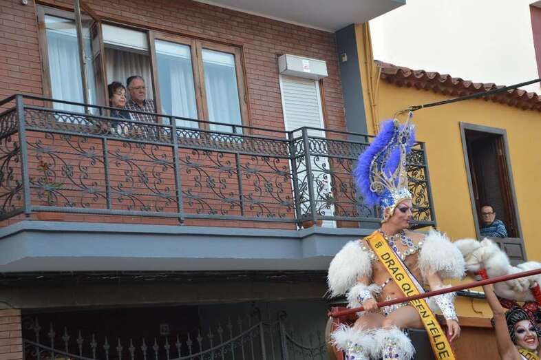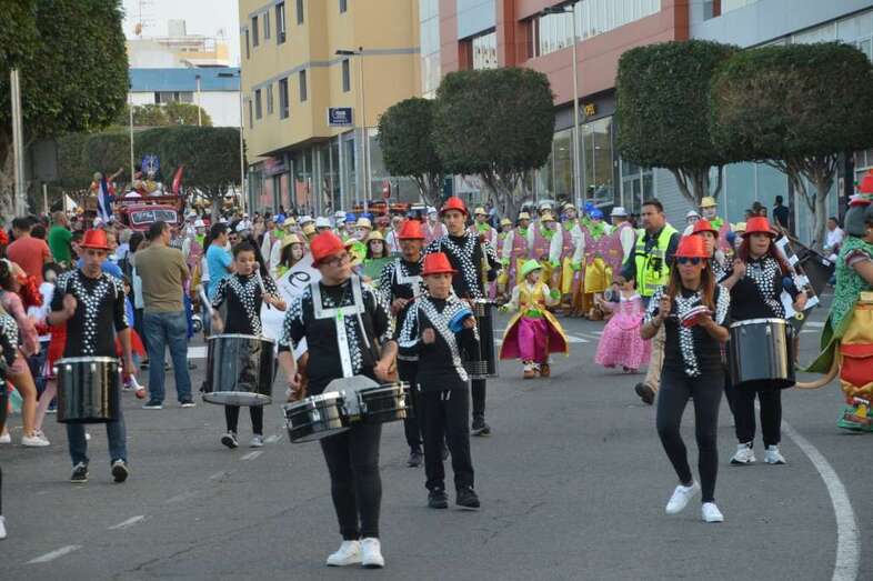Telde.- La Cabalgata del Carnaval de Telde ya inunda de alegría, colorido y ritmos latinos las calles del casco de la ciudad. La comitiva, en la que participan 35 carrozas, batucadas, comparsas, murgas, drags y cientos de mascaritas, se abre camino desde hace unos minutos, en una calurosa tarde, en dirección hacia la plaza de San Juan.
