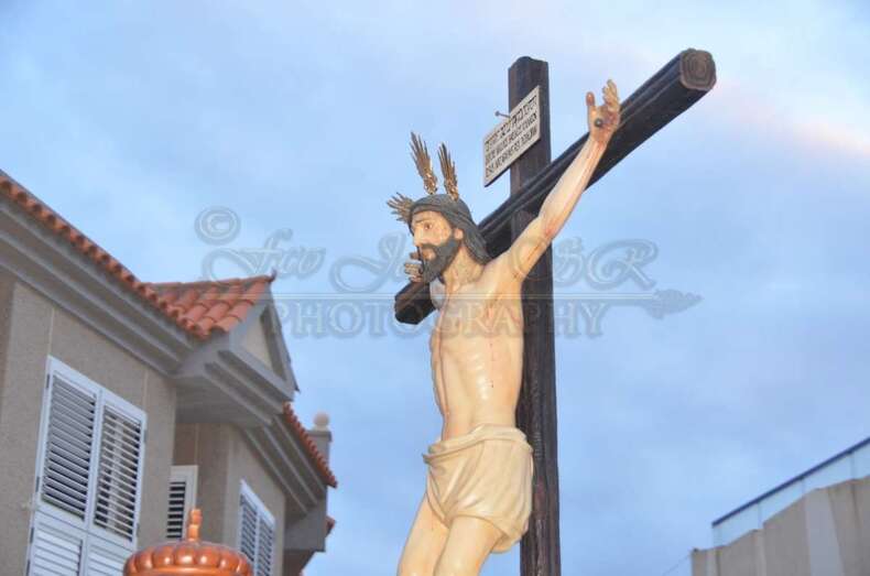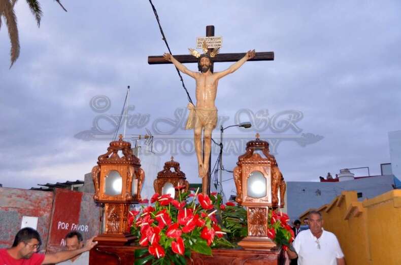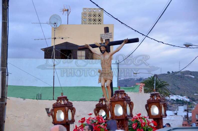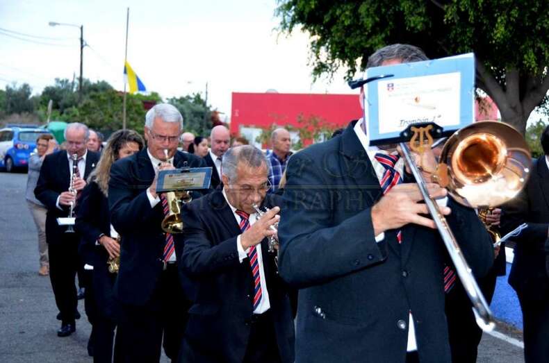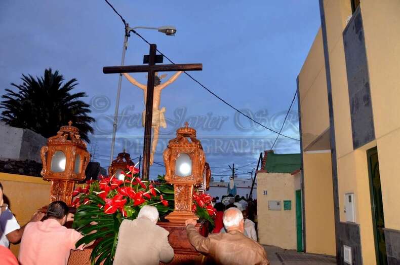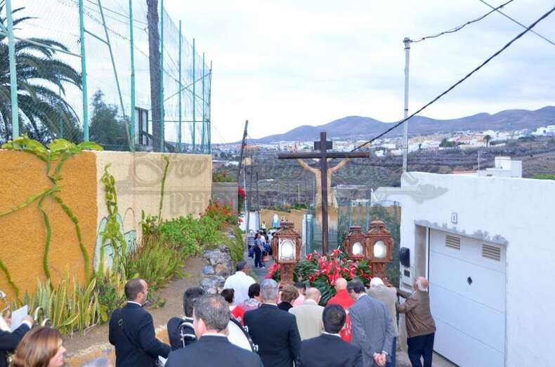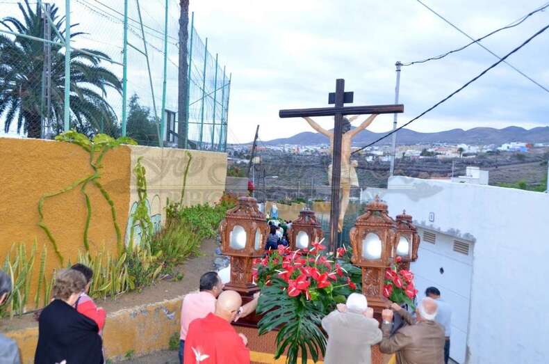 Los tronos de la Santa Cruz, Santa Bárbara y Santísimo Cristo del Perdón estuvieron acompañados por un grupo de feligreses, autoridades públicas y la Banda Municipal de Telde.