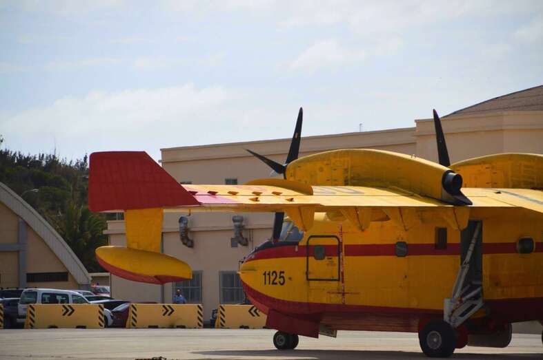 Telde.- La Base Aérea de Gando sirve estos días de plataforma de operaciones para las maniobras que dos aeronaves anfibias del 43 Grupo del Ejército del Aire, dedicadas a la lucha contraincendios, realizan en los cielos de Canarias de cara a la llegada del verano. TA ofrece imágenes de los dos aviones en Gando.