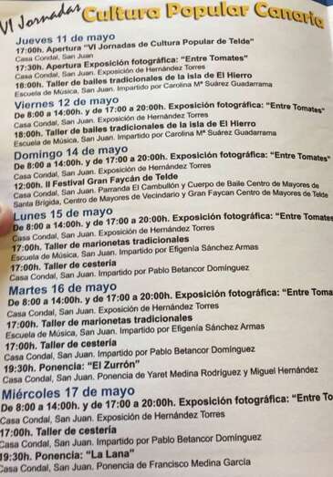 El programa presentado hace unos minutos por la alcaldesa Carmen Hernández y los ediles de Cultura y Deportes, Marta Hernández y Diego Ojeda, en un acto celebrado en la Casa Condal, contempla el desarrollo desde este jueves hasta el próximo 18 de mayo de las VI Jornadas de Cultura Popular, que ofrecerá en la Casa Condal de San Juan una completa agenda de exposiciones (muestra fotografíca Entre tomates), talleres gratuitos (bailes tradicionales, marionetas tradicionales y cestería), ciclo de ponencias, actuaciones musicales (II Festival Gran Faycán y Parranda El Volumen) y visitas culturales ( Museo de la Zafra en Vecindario).