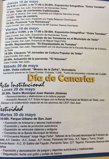El día grande de Canarias, el 30 de mayo, al igual que el pasado año el parque urbano de San Juan concentrará todas las actividades, con un programa de eventos que comenzarán a desarrollarse a partir de las 10 de la mañana y entre los que destacan una exposición de artesanía y labores tradiciones, muestra y venta de productos autóctonos, exposición de coches clásicos y antiguos, concierto de la Banda Municipal de Música, degustación de leche con gofio y potaje de berros, exhibición de juegos y deportes autóctonos y tradicionales y la celebración del VI Encuentro de Música Jorge Vega Peña, organizado por los talleres de la Escuela Municipal de Folclore de Telde, en el que participarán los grupos Cendro, Ansar, Arnao, Parranda del Vino, Tajea y Torna, Ábora, Salitre del Faycán, Taror, Tagoror, Parranda Nuevos Aires e Isleños.