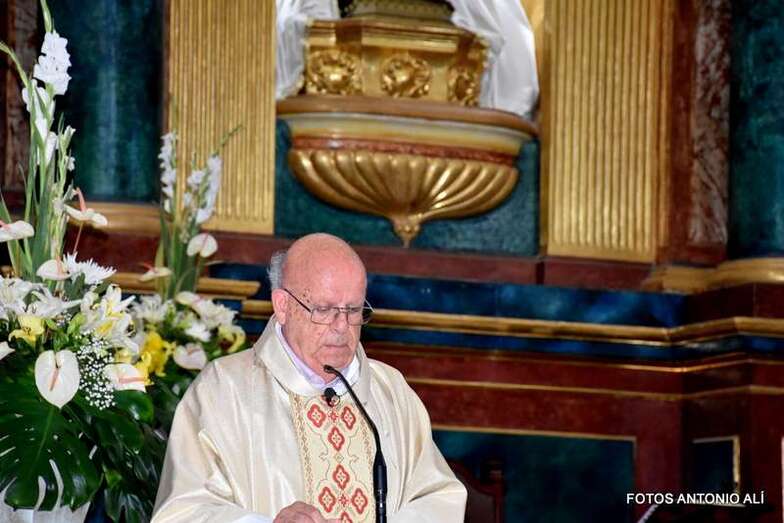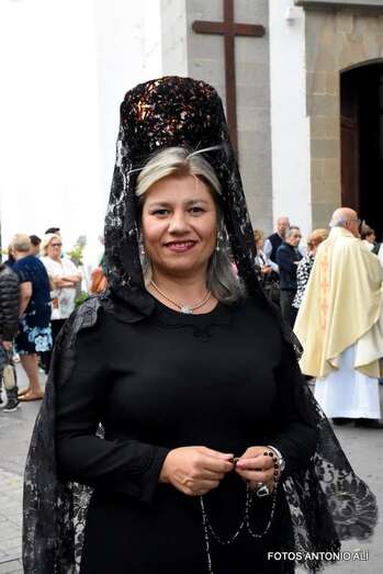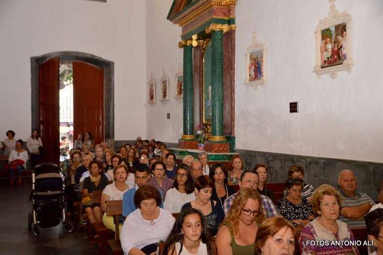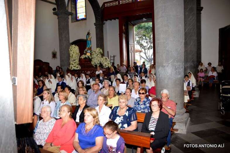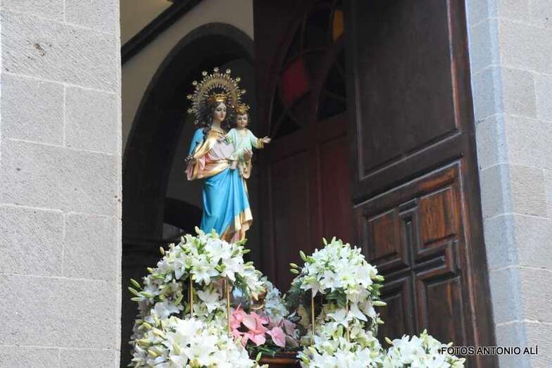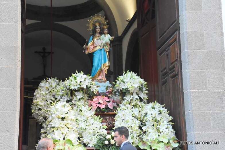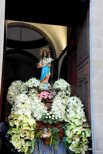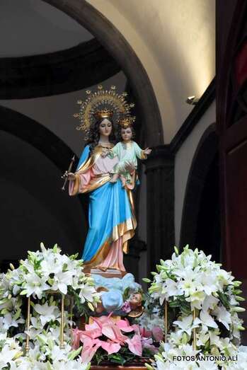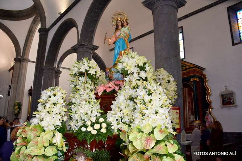 Al finalizar la misa que ofició el sacerdote Luis Marrero, sobre las 20.00 horas, la imagen de María Auxiliadora asomaba por el dintel del templo neoclásico de Los Llanos engalanada con un exorno floral a semejanza de una cascada y elaborado a base de liliums y rosas en tonos blancos, y también de anthuriums verdes y rosados.