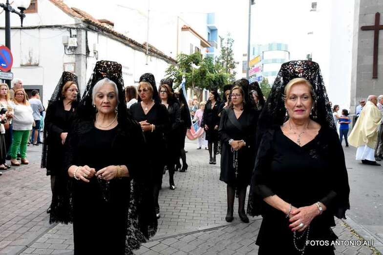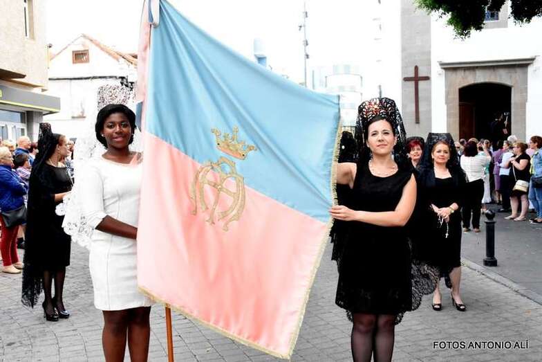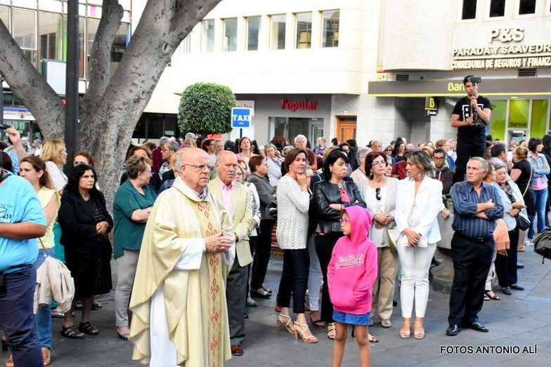 Telde.- El 24 de mayo es una fecha especial para la comunidad salesiana de Telde y todos aquellos que algún día formaron parte de ella. El colegio de Los Llanos paseó esta tarde a su patrona, María Auxiliadora, por las calles del entramado comercial de Telde en una procesión que estuvo arropada por cientos de teldenses que salieron al encuentro de la imagen mariana.