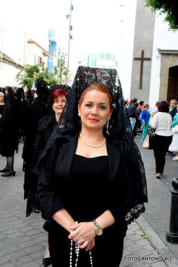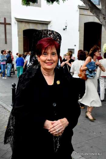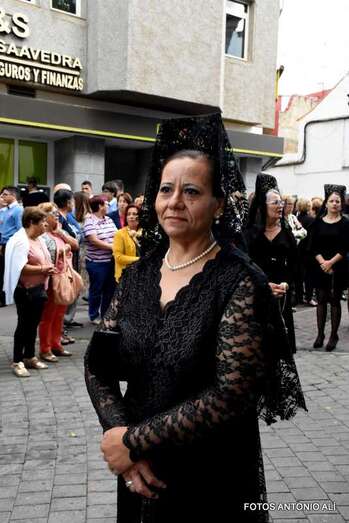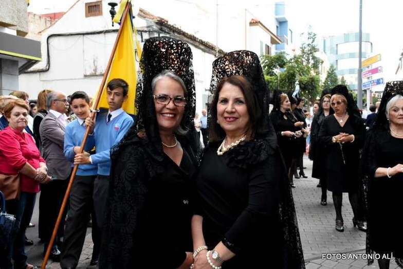 Antes de salir la imagen a la plaza de Los Llanos, la comitiva salesiana ya ocupaba toda la parte alta de la Avenida de la Constitución. Los alumnos de infantil abrían un cortejo ordenado por edades y cerraba una representación de mujeres con mantilla española precedida del grupo de 4º de ESO, jóvenes que este año, al finalizar el curso, abandonarán el colegio para iniciar la etapa de Bachillerato en otro centro, vestidos de traje típico los chicos y de mantilla canaria las chicas.