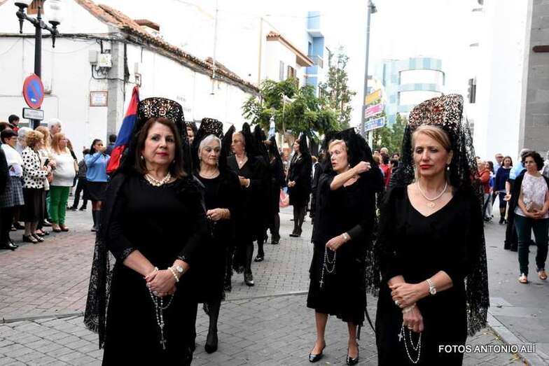 Entre cánticos y rezos, la comitiva se fue abriendo paso poco a poco por la Avenida de la Constitución para continuar por las calles Navarra y El Salvador hasta llegar a este colegio de Los Llanos que abrió sus puertas a mediadios del siglo pasado, allá por el año 1949, y por el que ha pasado buena parte de la sociedad teldense.