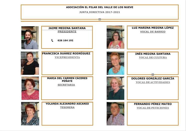 El nuevo órgano ejecutivo, encabezado por Jaime Medina Santana que repite en el cargo, está compuesto por otros siete miembros: Francisca Suárez Rodríguez como vicepresidenta, María del Carmen Cáceres Peñate como secretaria, Yoanda Alejandro Ascanio en calidad de tesorera, Luz Marina Medina López desarrollando las funciones de vocal de barrio, Inés Medina Santana las de vocal de cultura, Dolores González García como vocal de actividades y Fernando Pérez Mateo de peticiones.