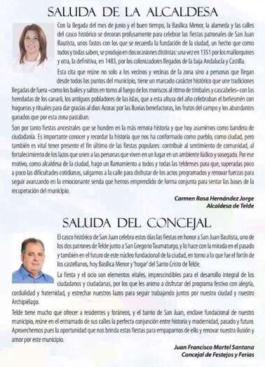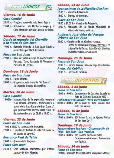 Telde.- La ciudad de Telde ya conoce el programa de actos de las fiestas de su patrono, San Juan Bautista. Diez jornadas de celebraciones que arrancarán el próximo viernes, 16 de junio, con el pregón del vecino Julio Pérez Tejera y en las que se apuesta por recuperar la víspera y potenciar los eventos ya consolidados.