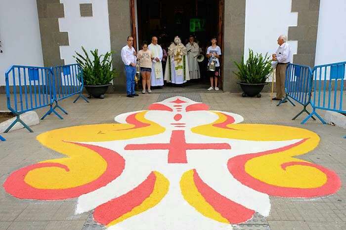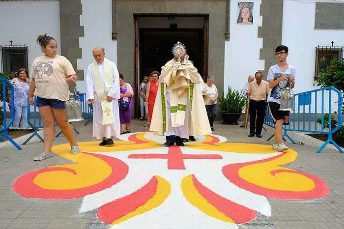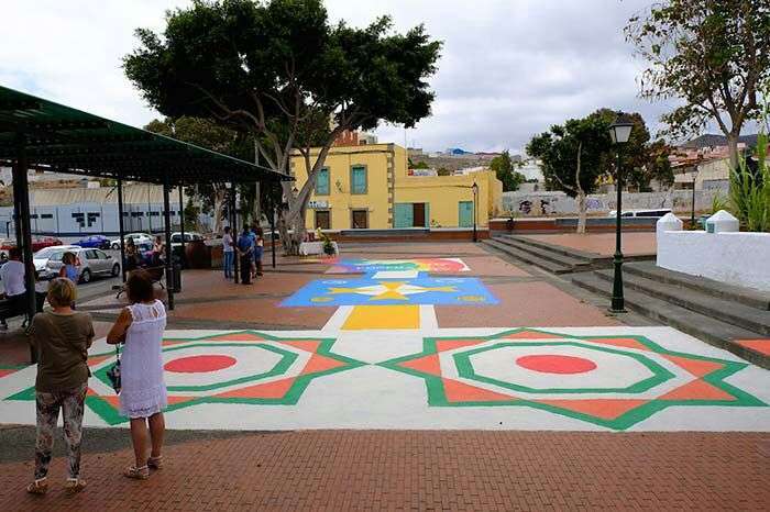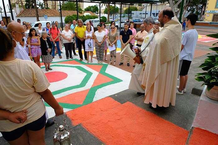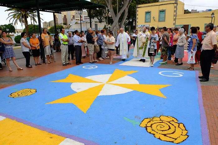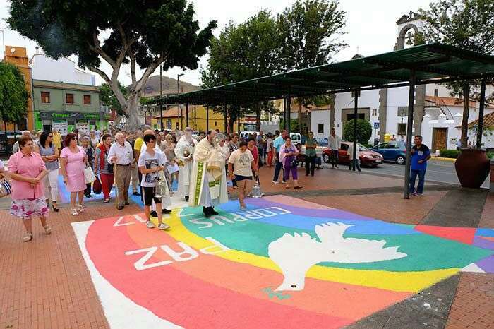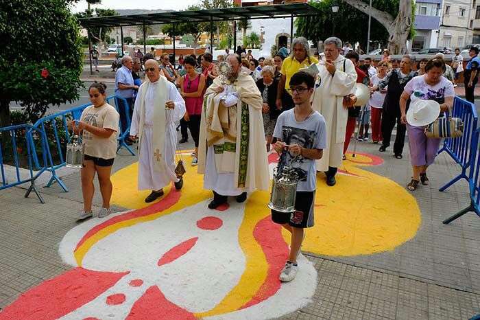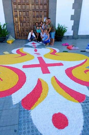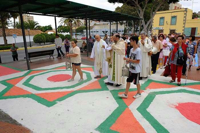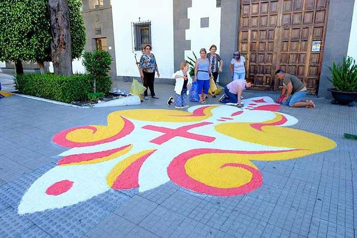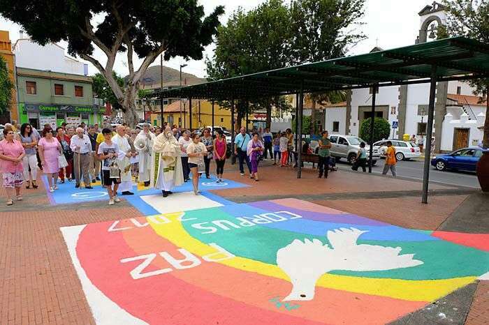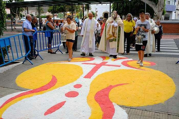 Telde.- La plaza del casco antiguo de Jinámar se llenó este domingo de alfombras multicolores con símbolos religiosos con motivo de la celebración del Corpus Christi, gracias a una iniciativa del Patronato de Fiestas, Cultura y Deportes La Concepción y La Caña Dulce de Jinámar, la parroquia del barrio y la pastoral juvenil.