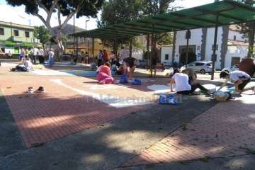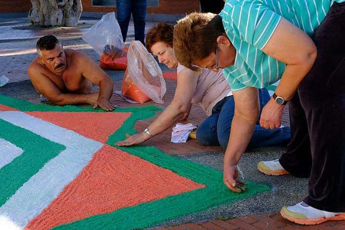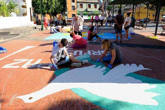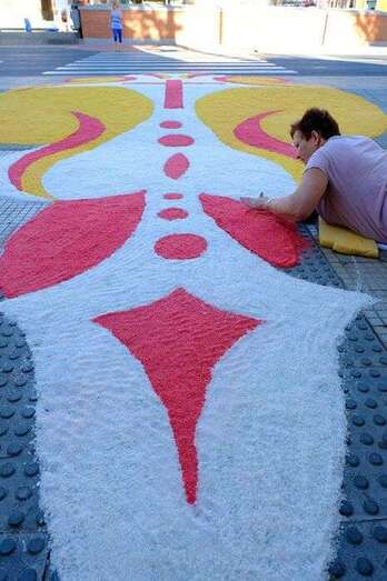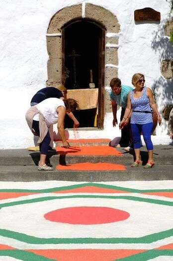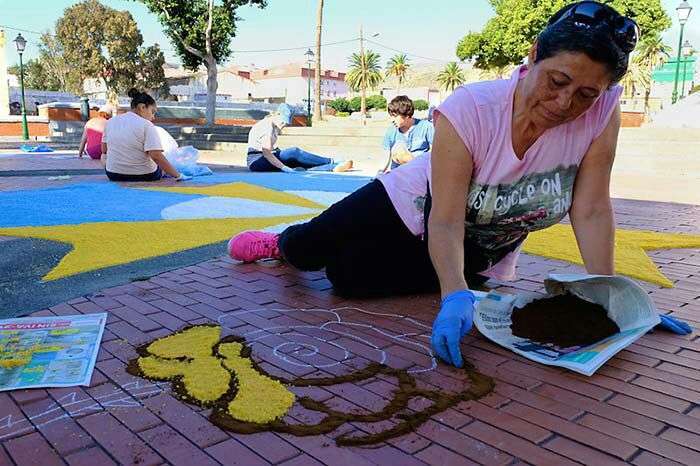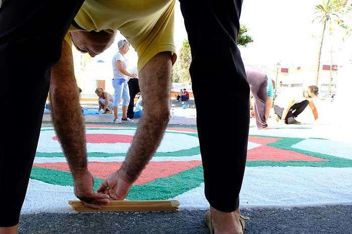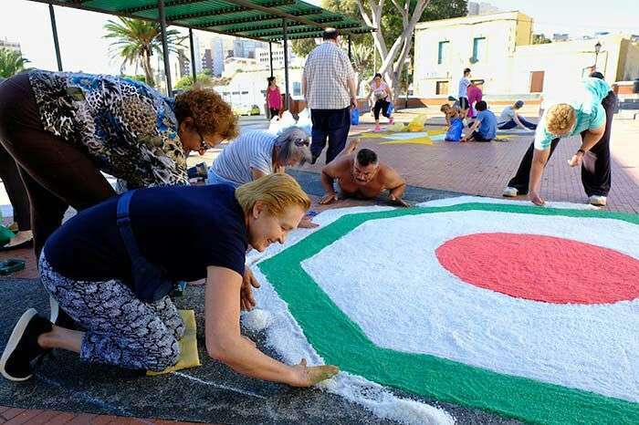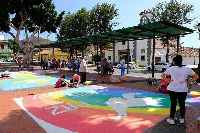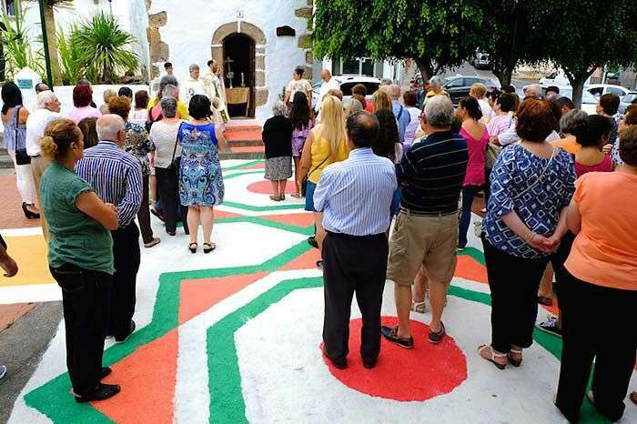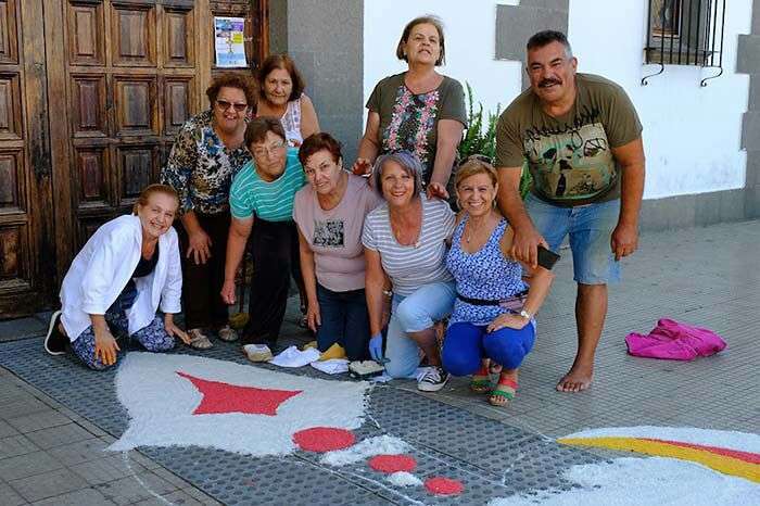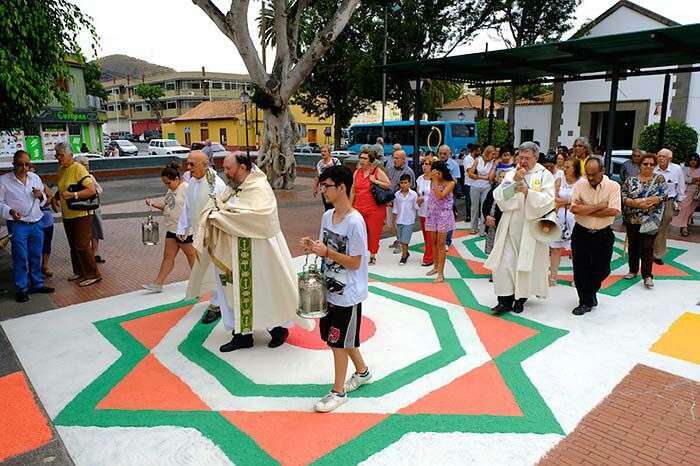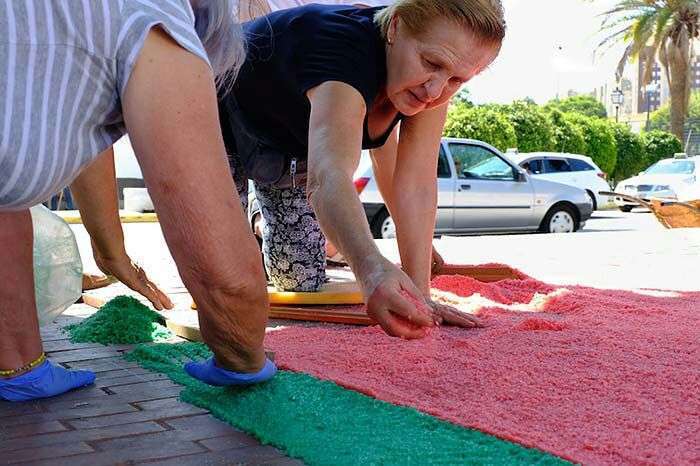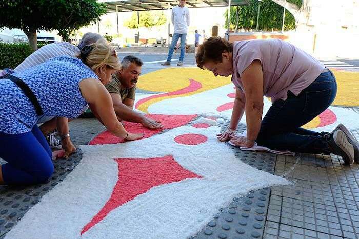 Telde.- La plaza del casco antiguo de Jinámar se llenó este domingo de alfombras multicolores con símbolos religiosos con motivo de la celebración del Corpus Christi, gracias a una iniciativa del Patronato de Fiestas, Cultura y Deportes La Concepción y La Caña Dulce de Jinámar, la parroquia del barrio y la pastoral juvenil.