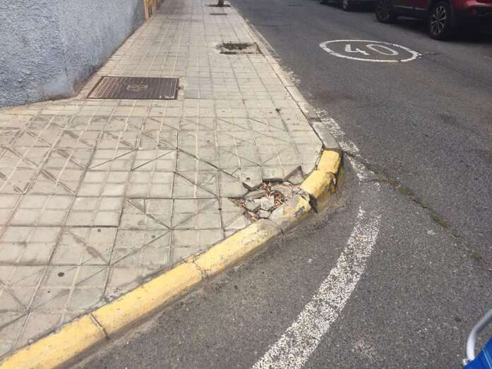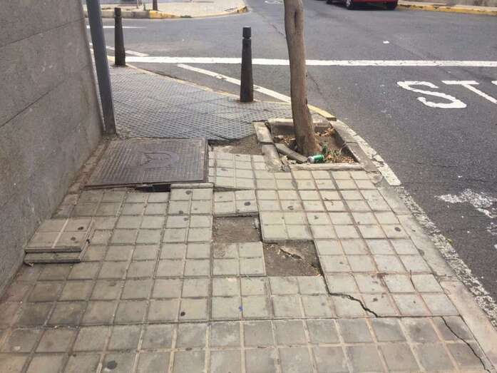 Telde.- Ser peatón y atravesar la calle Cristóbal Colón, en el barrio de Clavellinas, se ha convertido en toda una suerte de travesía. Los vecinos se enfrentan a diario a una acera completamente irregular, con sus adoquines levantados, bordillos dañados y arquetas que sobresalen, no apta para tobillos frágiles.