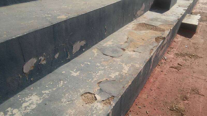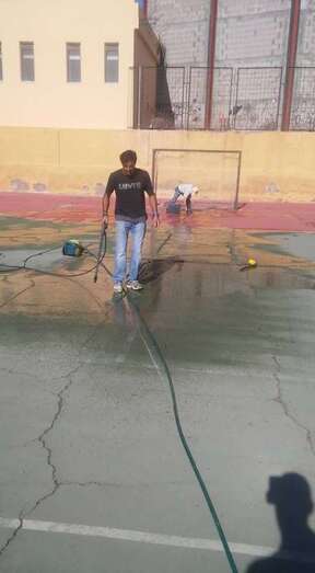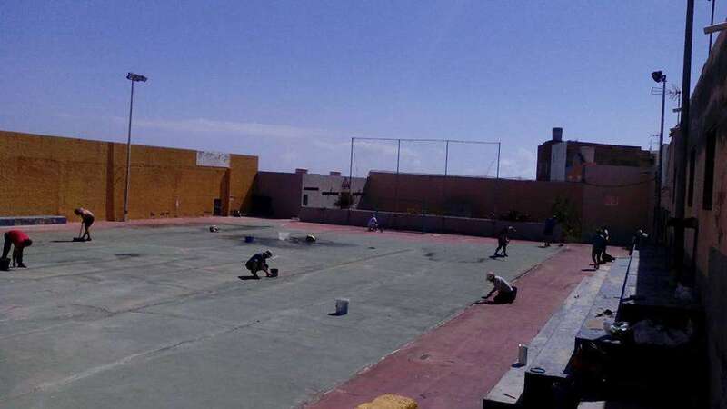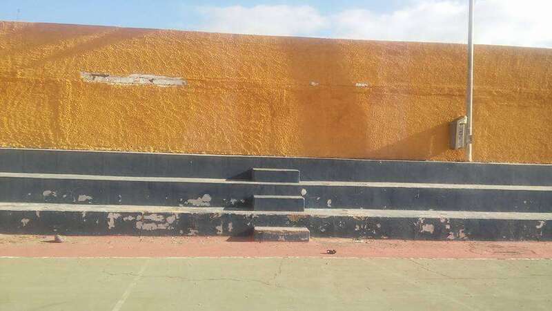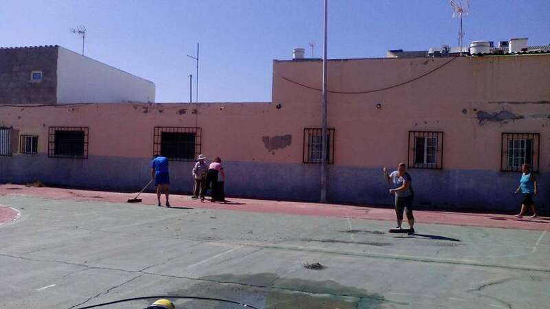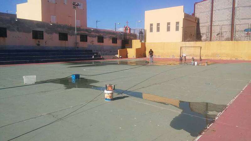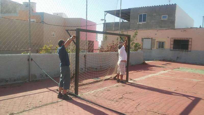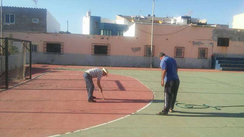 Hombres y mujeres, mayores y jóvenes, todos a una, al pie del cañón. Mientras unos pican y cubren las grietas del suelo, otros acarrean sacos de cemento y mortero, se encargan de barrer, enfoscar los muros o colocar nuevas redes en las porterías. Ahora les falta terminar de parchear algunos huecos y luego comenzarán con los trabajos de pintura.