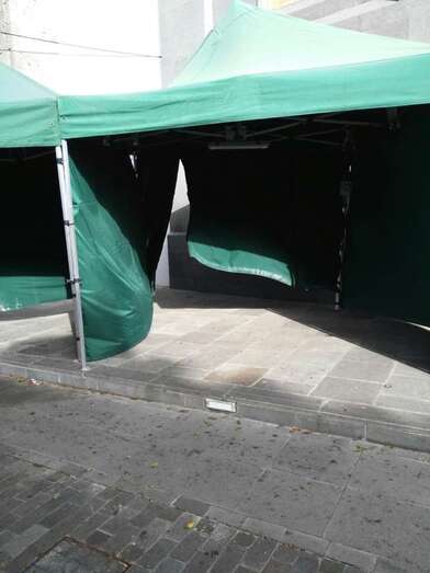 Las casetas bajo las que se guarecerán estos artesanos y sus productos no han resistido el embate del viento que ha arreciado en las últimas horas y se han convertido casi en objetos voladores.