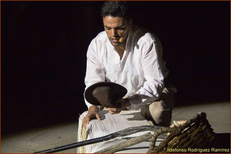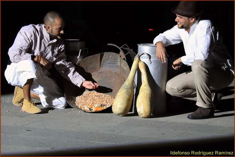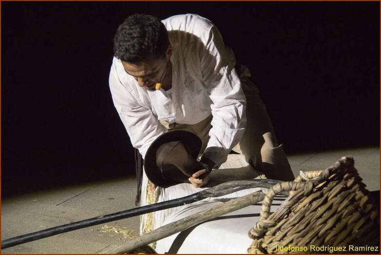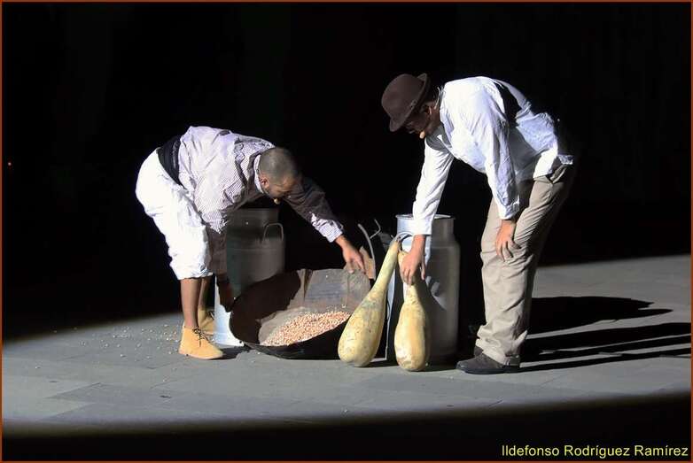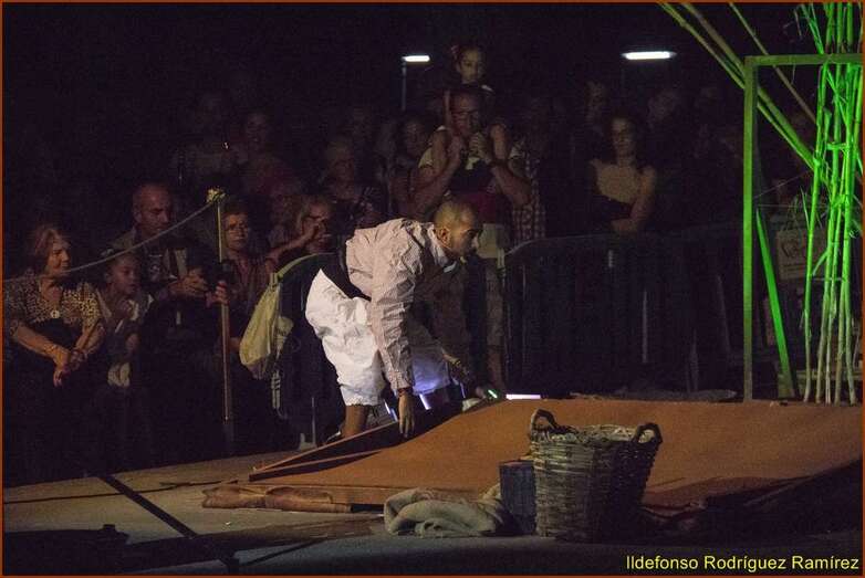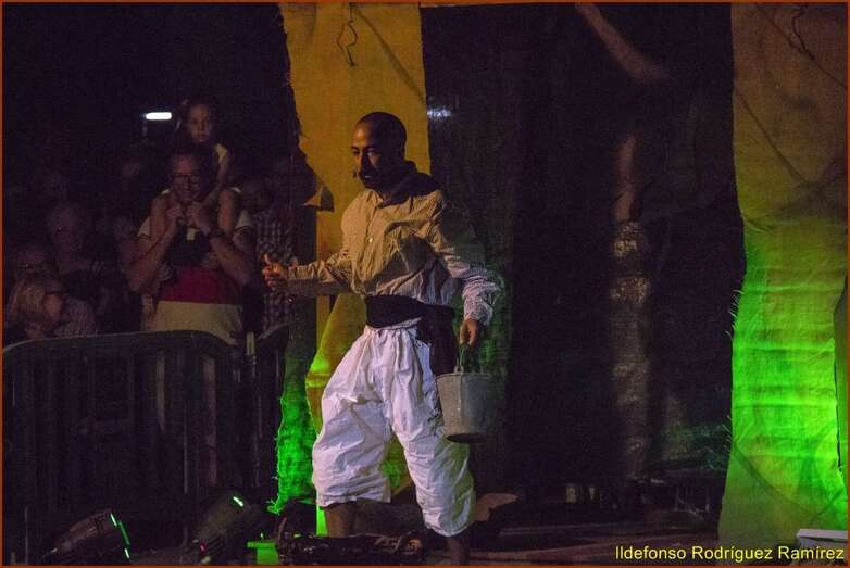 La plaza de San Juan fue anoche un gigantesco escenario al aire libre para la puesta en escena del espectáculo de teatro callejero Historia de un cuarto de aperos, una obra escrita y dirigida por Aduén Amaya que, de la mano de Juan el Bucio, trasladó durante una hora a los asistentes a un universo entre costumbrista y mágico.