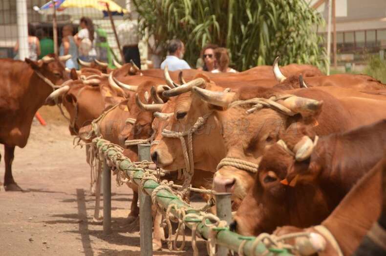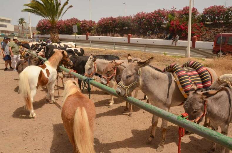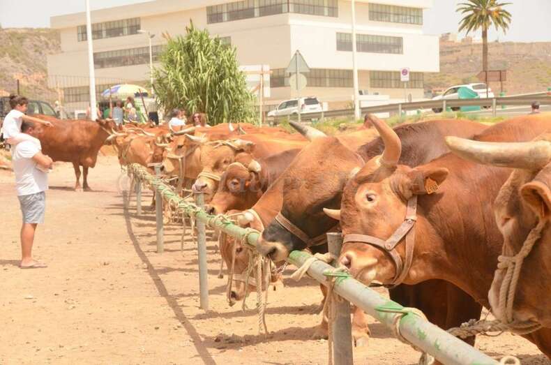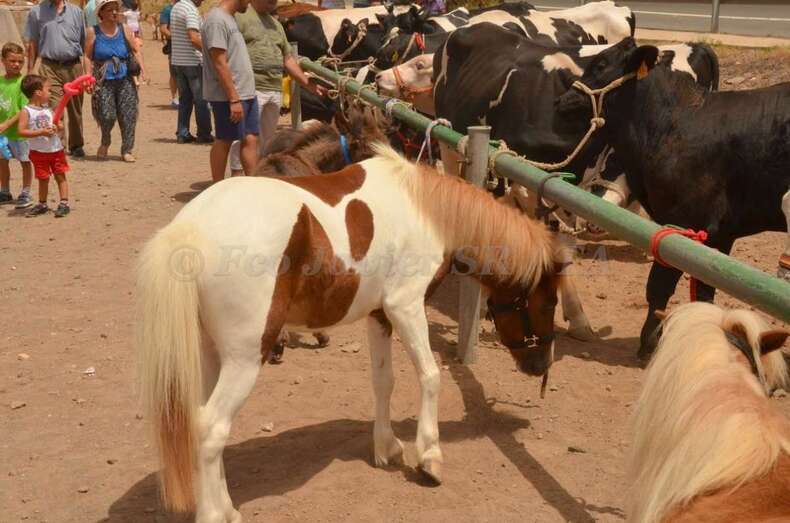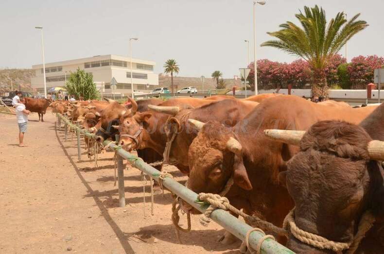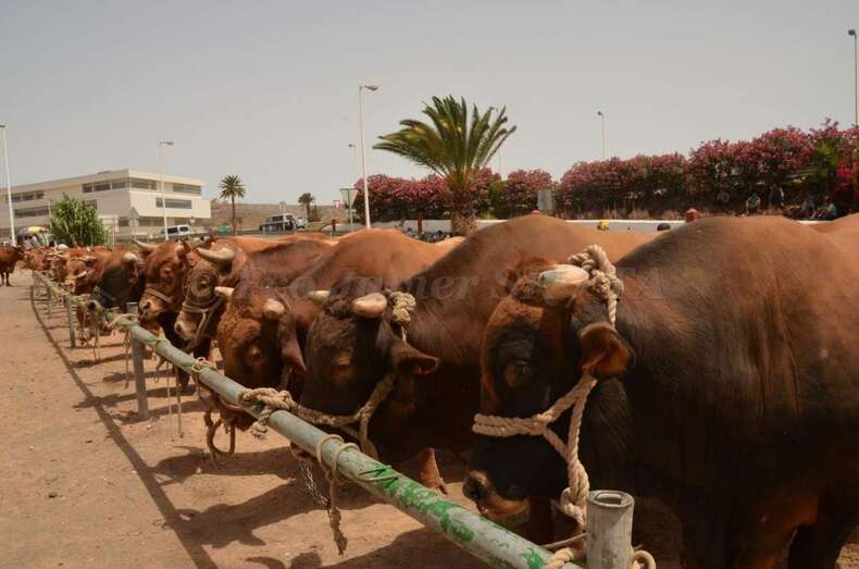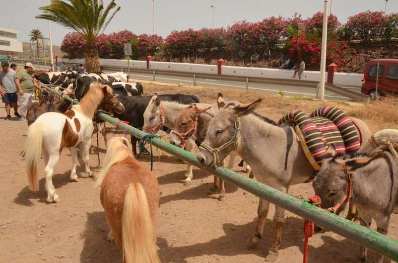 Telde.- En un ambiente sofocante por las altas temperaturas y humedad, unos 130 animales se exhiben desde las 10 de la mañana de este sábado en la muestra de ganado de las fiestas patronales de San Juan montada en un aparcamiento de tierra situado en la zona de La Placetilla. TA avanza imágenes.