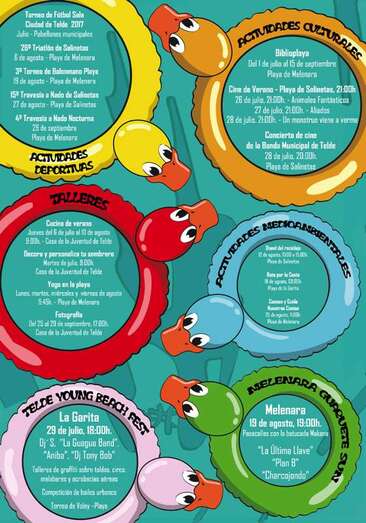 Así, el 29 de julio La Garita, a partir de las 18.00 horas, acoge el Telde Young Beach Fest, con la actuación de Tony Bob y otros dj’s, La Guagua Band, Enkassete y el rapero Aniba, grafittis, circo, malabares, una competición de bailes urbanos y un torneo de voley playa. En Melenara, por su parte, se celebrará el 19 de agosto (19.00 horas) el Guateque Sun, con los conciertos de La última llave, Plan B y Charcojondo, y un pasacalles con la batucada Makana.