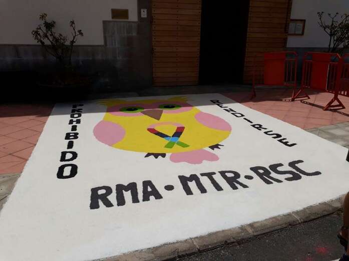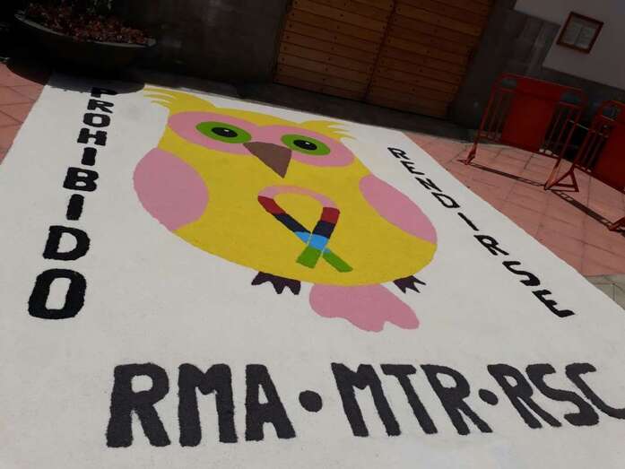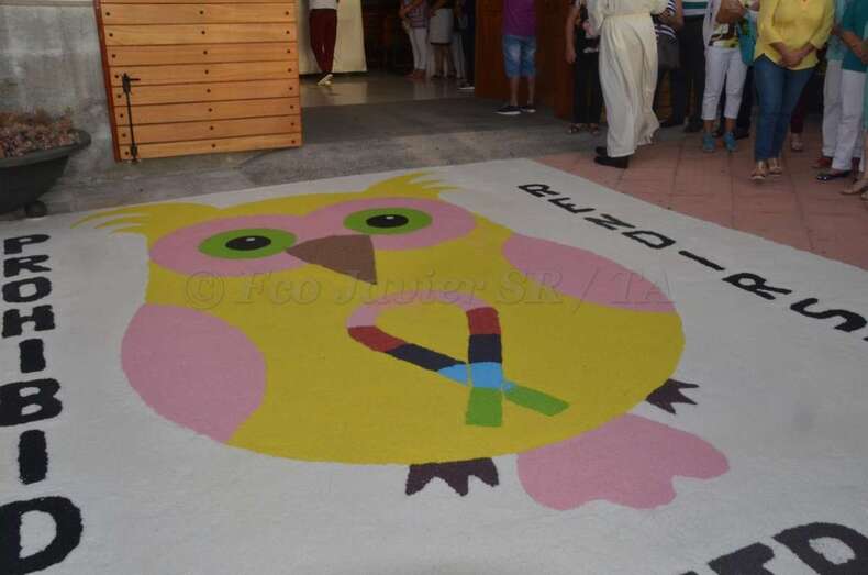 Delante de la puerta principal del templo, vecinos del barrio tapizaron la acera con una alfombra de sal alegórica a la festividad de Santiago Apóstol.