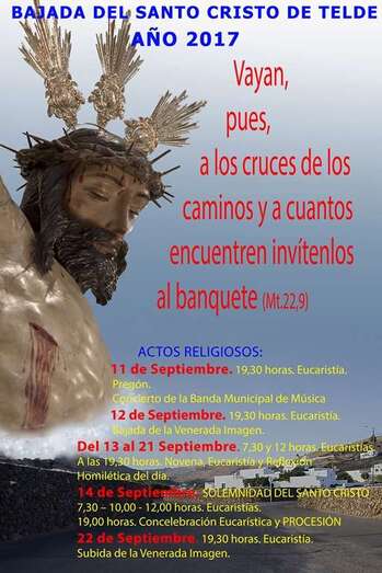 El novenario del Santo Cristo de Telde se extenderá del 12 al 22 de septiembre. Todos estos días se rezará el Santo Rosario a partir de las 19.00 horas. A continuación, a las 19.30 horas, se oficiará la eucaristía. Además, desde el 13 y hasta el 22 también se oficiarán misas a las 7.30 y 12.00 horas.
