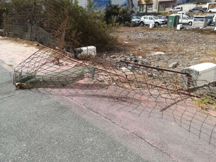 Presumiblemente el viento ha tirado las pilastras que mantienen esta verja que ahora ocupa parte de la acera de la calle de La Palmera, que se adentra en esta cala teldense y en la que se asientan varias terrazas.