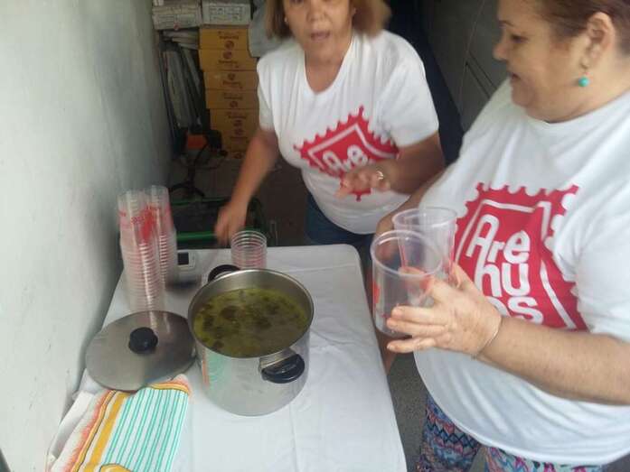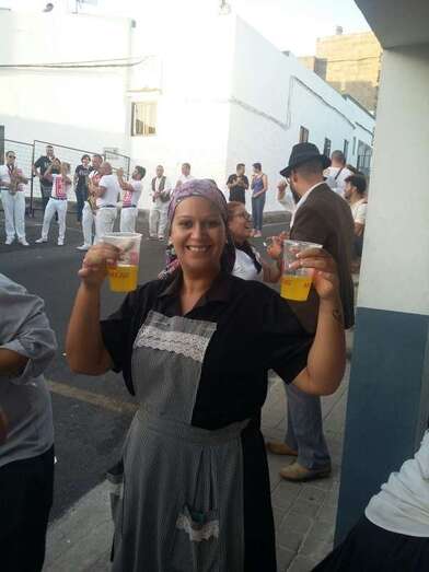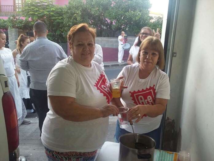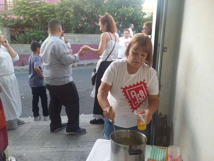 Allí, Carmela López y sus vecinas agasajaron un año más en plena calle a los miembros de la agrupación y a sus acompañantes con un desayuno reparador de fuerzas a base de compuesto de café, chocolate, bollitos y tortillas de harina. Entre las bebidas no faltó a la cita el Clipper de fresa, tal habitual en los tenderetes canarios.