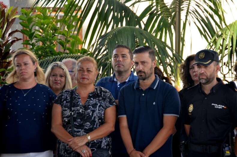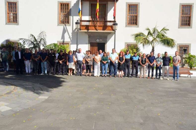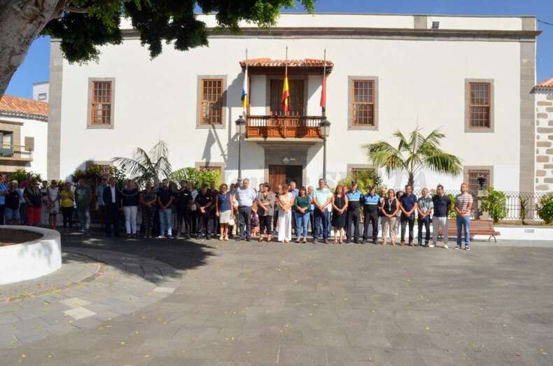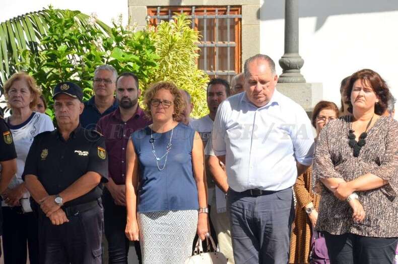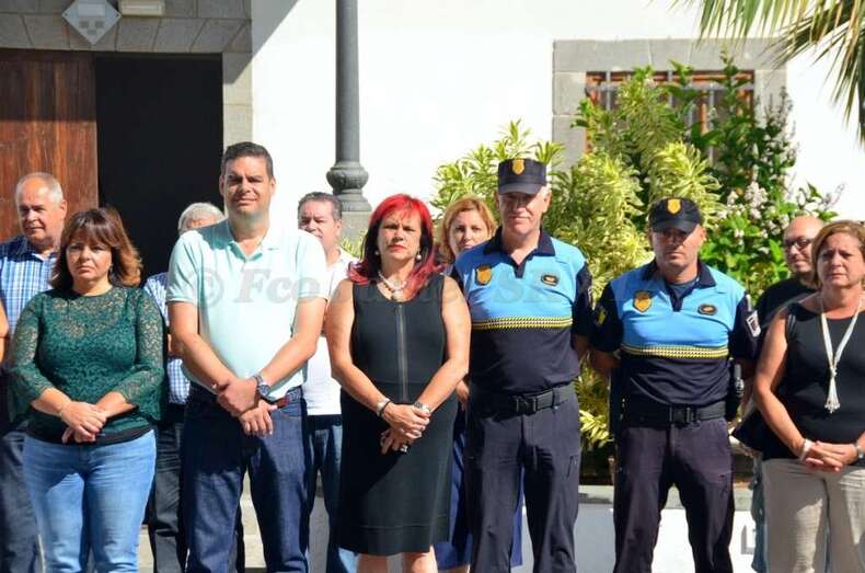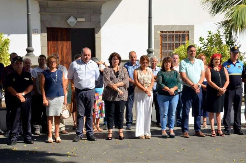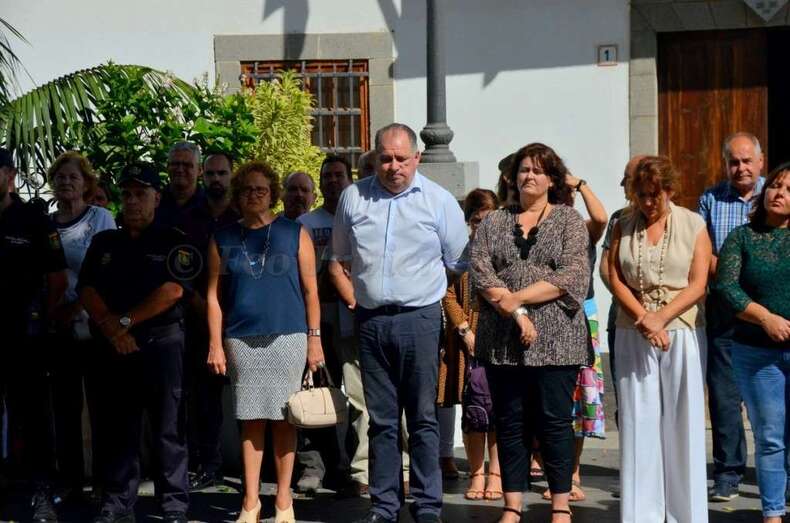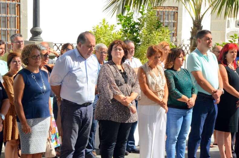 Una comitiva institucional conformada por alrededor de medio centenar de personas, con la alcaldesa Carmen Hernández al frente, representantes de todas las fuerzas políticas con presencia en el Consistorio, el comisario de la Policía Nacional en Telde, Jesús García Aller; y el jefe de la Policía Local, Félix Ramos, así como por trabajadores municipales y vecinos del municipio, guardaban cinco minutos de silencio en San Juan, a los pies de las Casas Consistoriales.