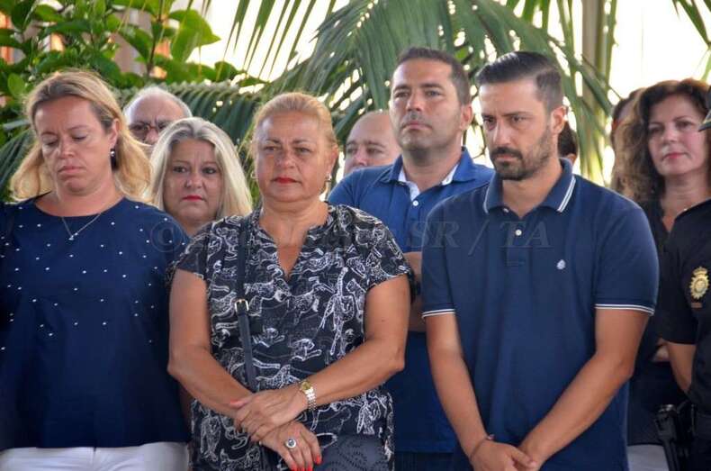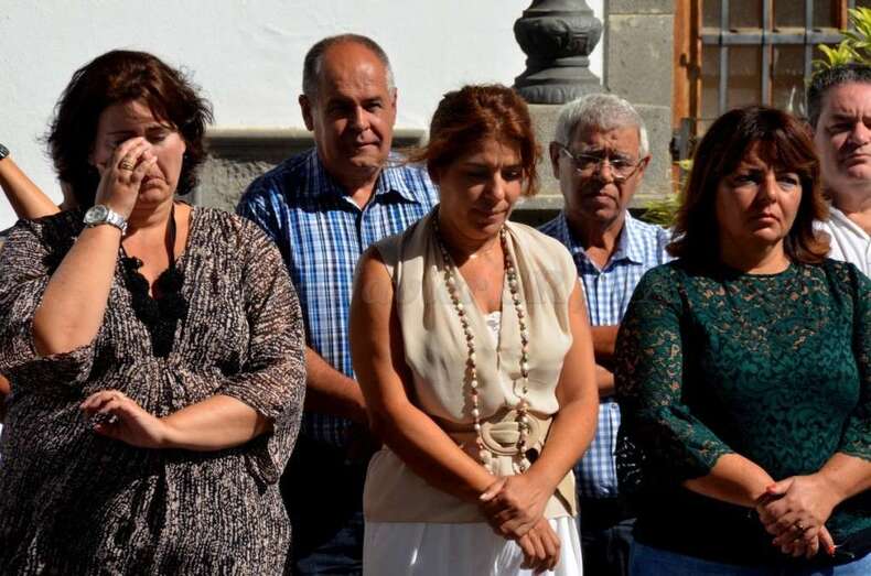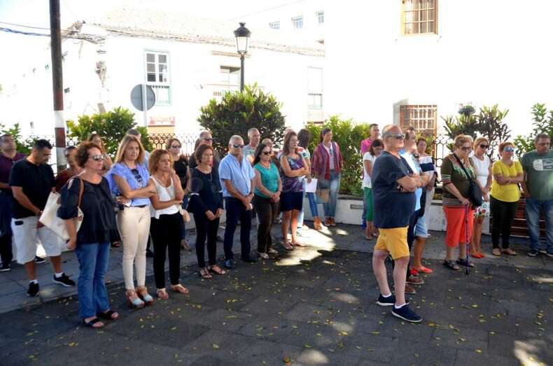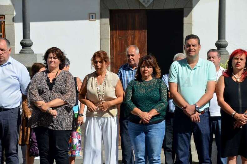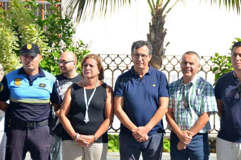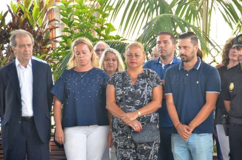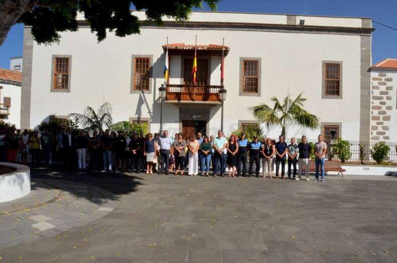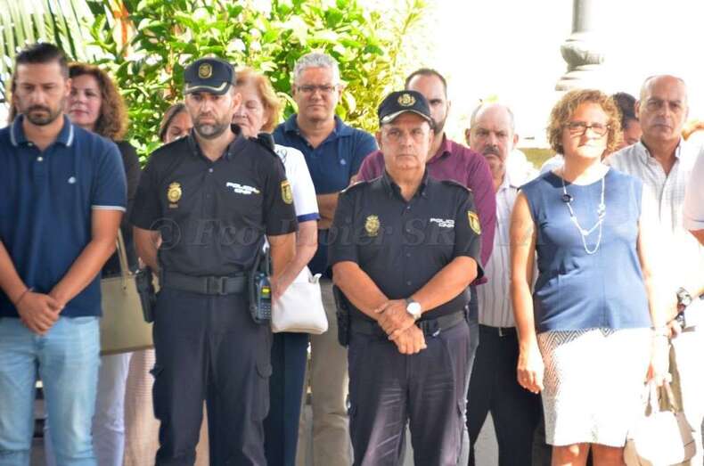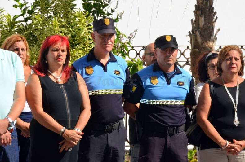 Una comitiva institucional conformada por alrededor de medio centenar de personas, con la alcaldesa Carmen Hernández al frente, representantes de todas las fuerzas políticas con presencia en el Consistorio, el comisario de la Policía Nacional en Telde, Jesús García Aller; y el jefe de la Policía Local, Félix Ramos, así como por trabajadores municipales y vecinos del municipio, guardaban cinco minutos de silencio en San Juan, a los pies de las Casas Consistoriales.