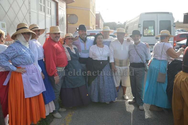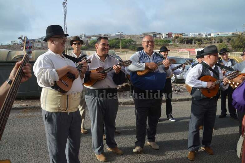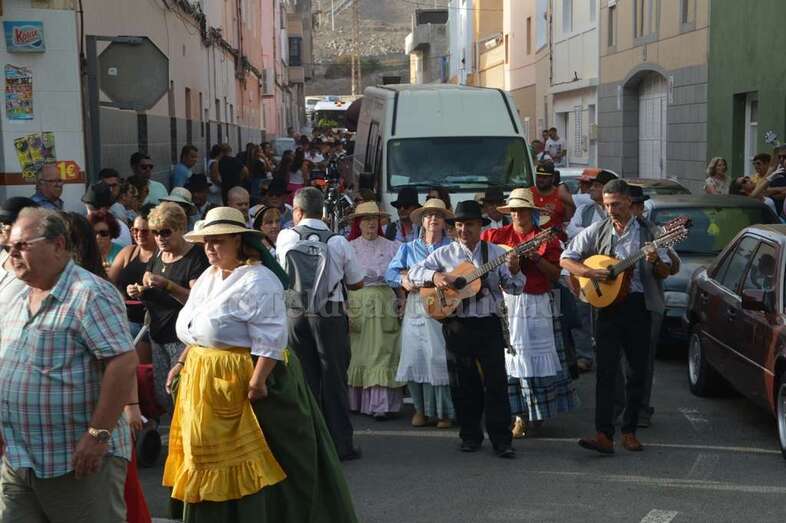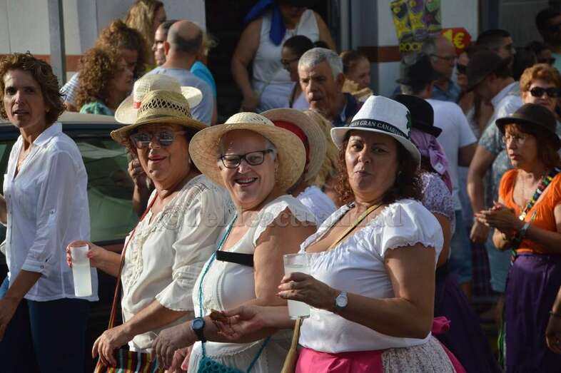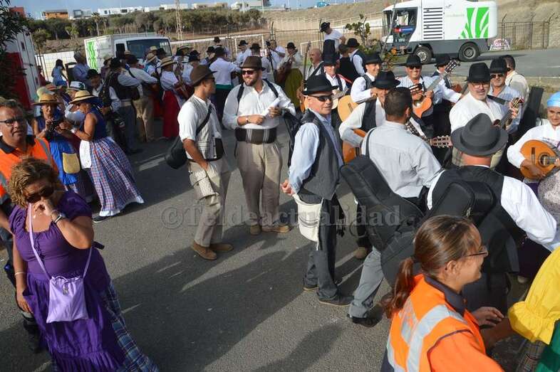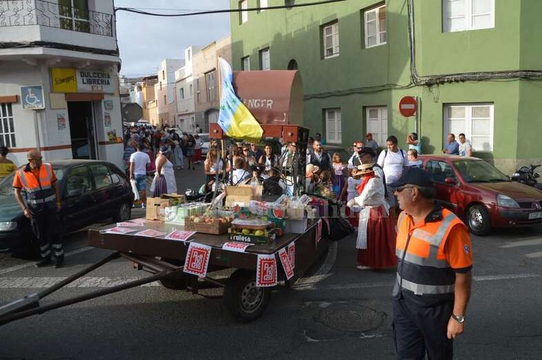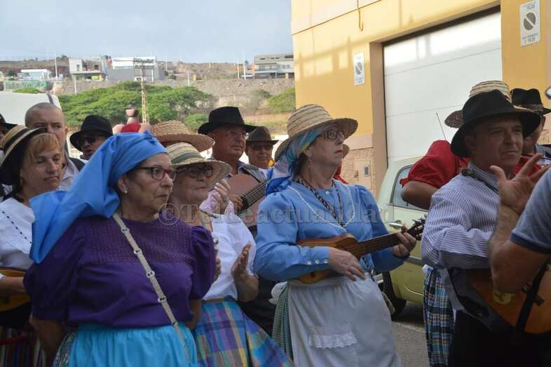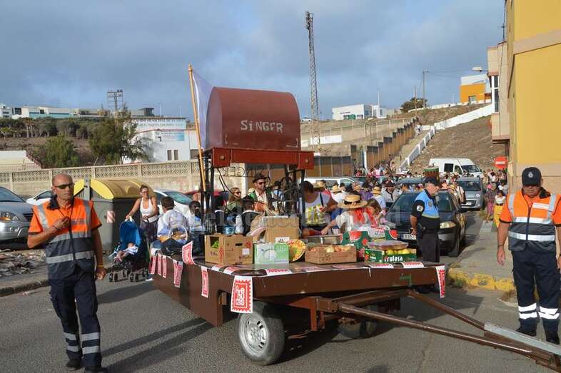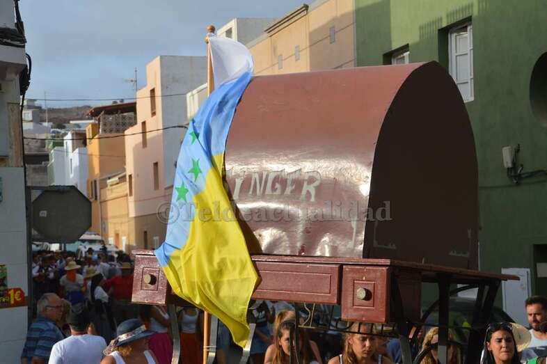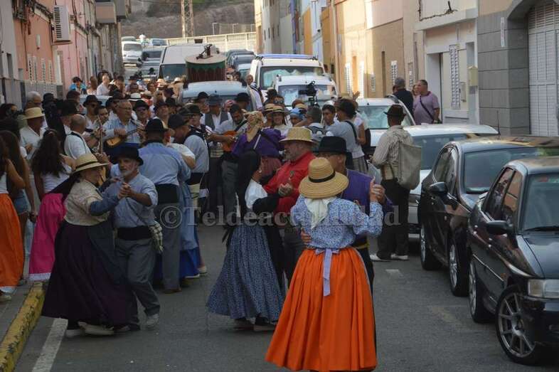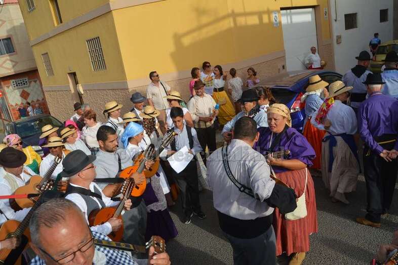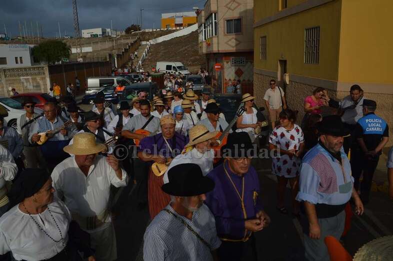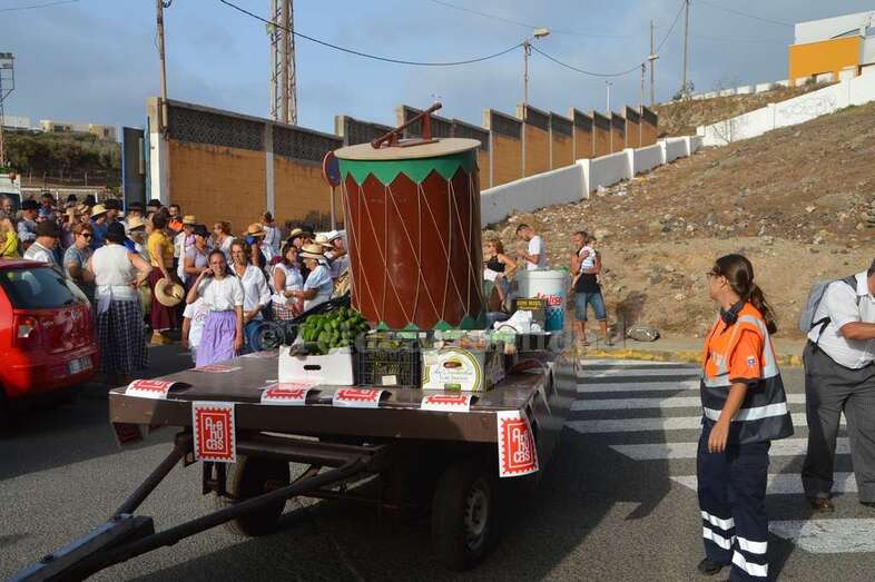 Tres carretas, con el acompañamiento de tres grupos musicales de la Escuela Municipal de Folclore, aportaron color y bullicio a la alegre comitiva que partió del entorno del campo de fútbol de Melenara pasadas las 19.00 horas y que concluyó hora y media después con la ofrenda y un baile de taifas en la plaza de Clavellinas.