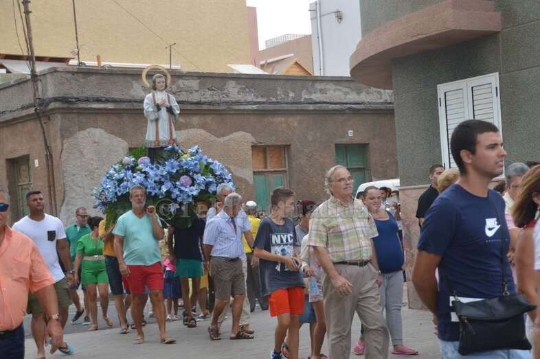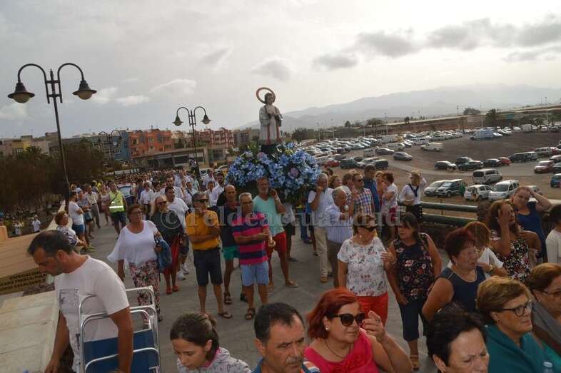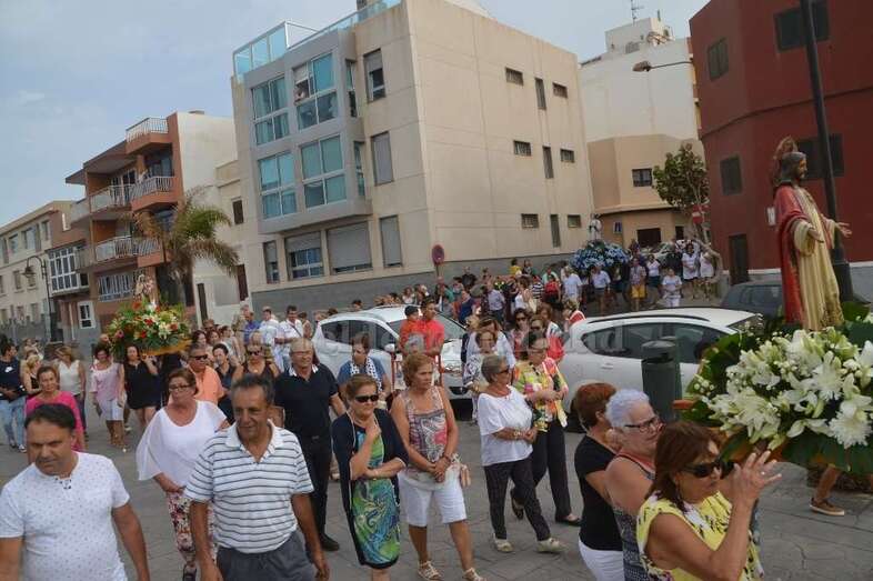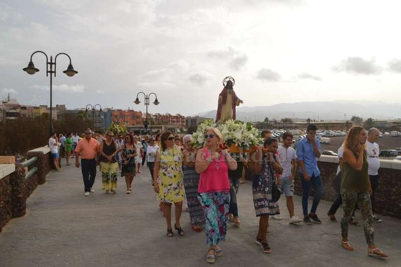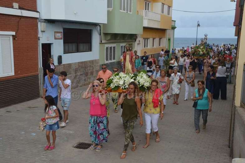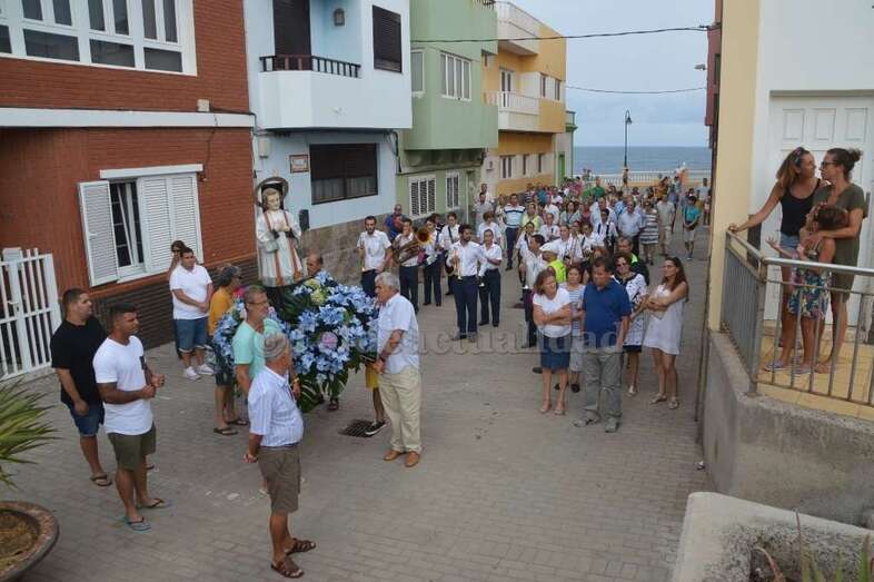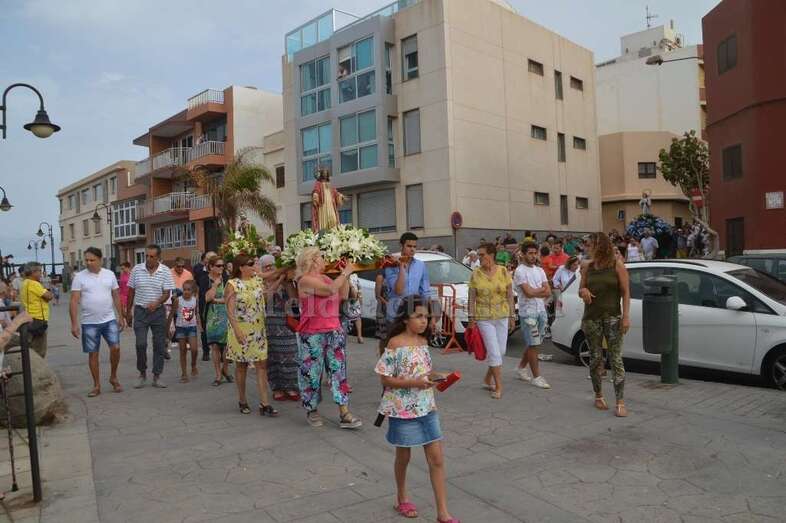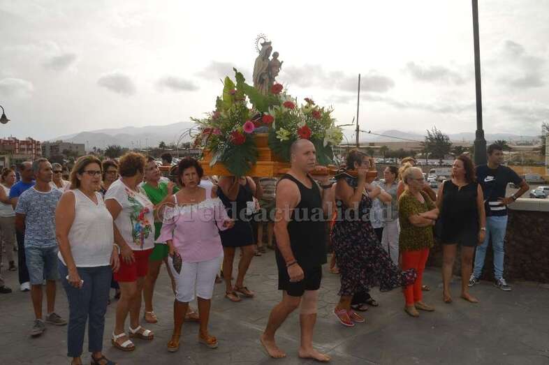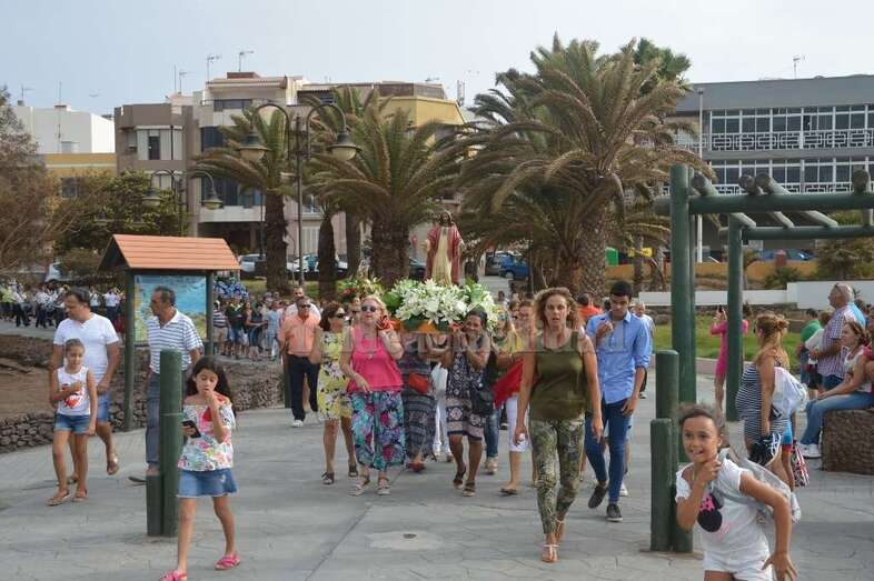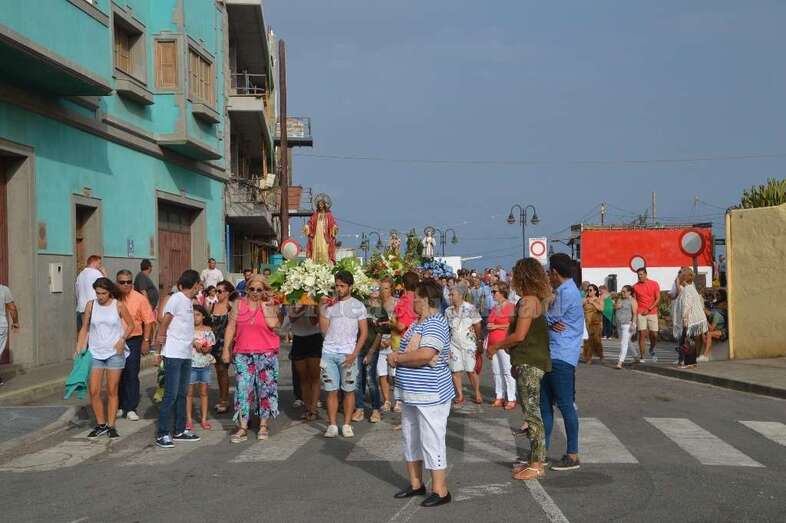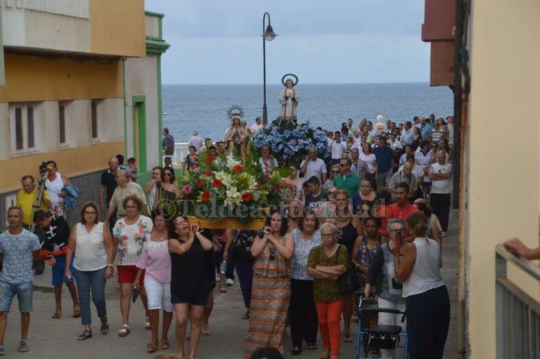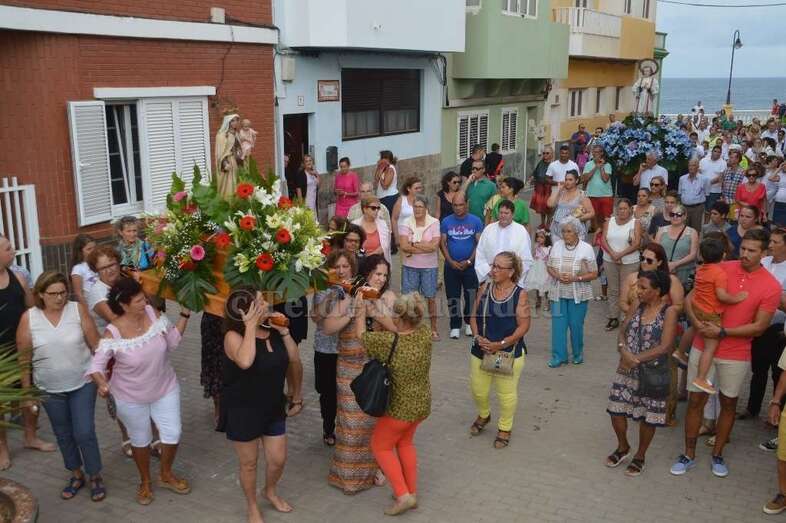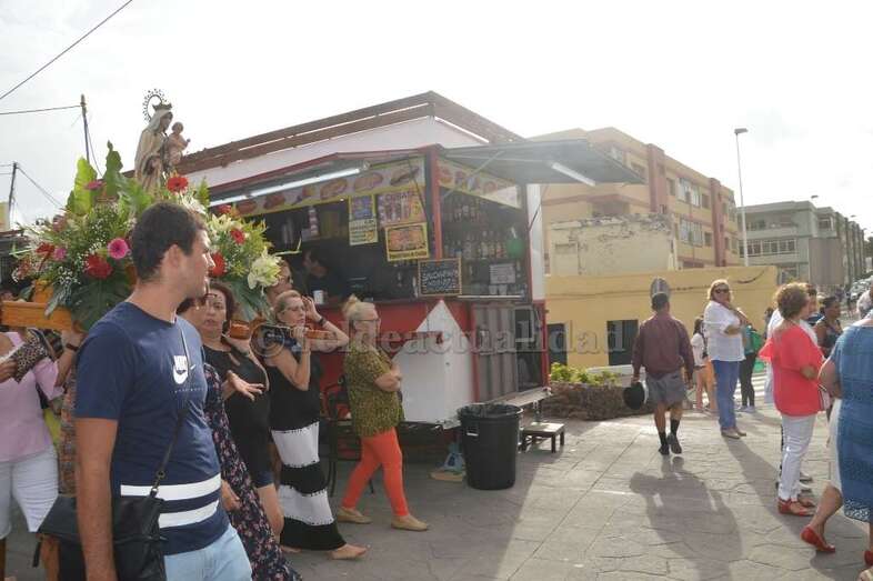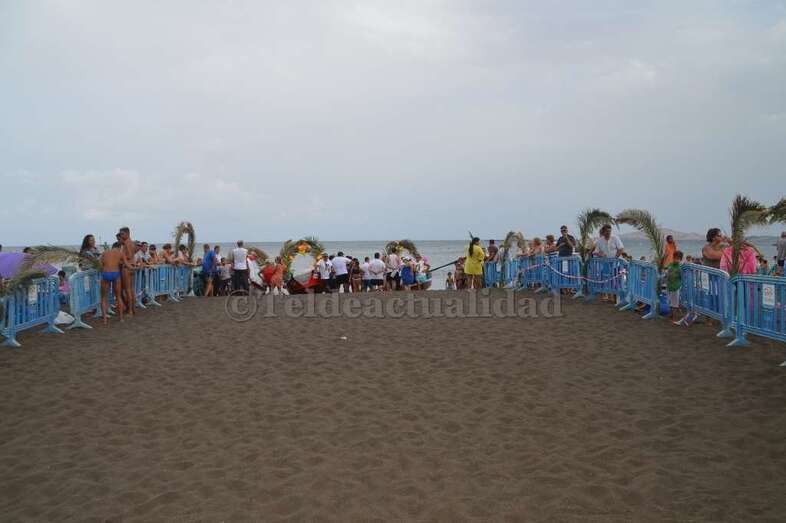 Después de un recorrido por la avenida de Melenara, la procesión enfilo el sector viejo de esta playa donde fue saludada por varias descargas de voladores y los vivas del público. Poco a poco, las imágenes se fueron acercando hasta la arena de la playa, en donde les esperaban las tres embarcaciones de pescadores que las pasearían por el litoral de Melenara, Taliarte, Claveillas y Salinetas.
