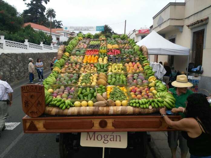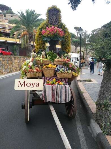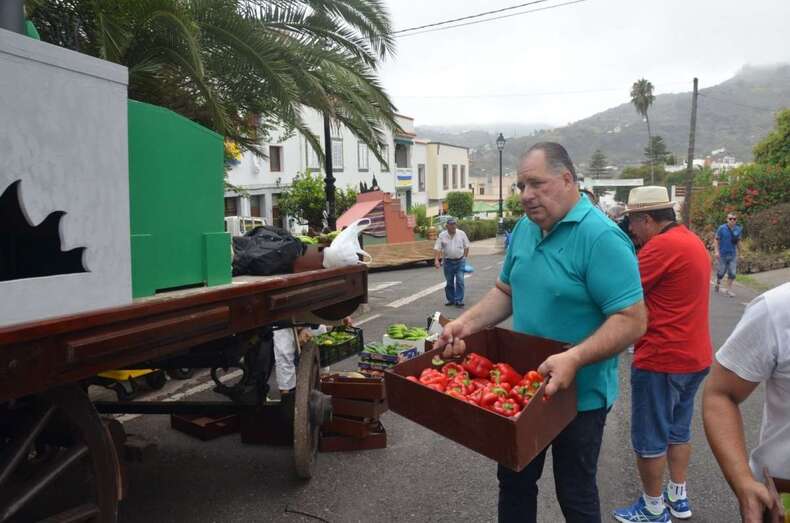 Tiradas por bueyes y adornadas con elementos representativos de unos y otros lugares, desde una gigantesca cesta que abarcaba toda la superficie de una de ellas hasta una barca o un molino que lucían otras, han sido los vehículos usados para transportar cientos de kilos de alimentos que se han ofrecido a la patrona de la isla.