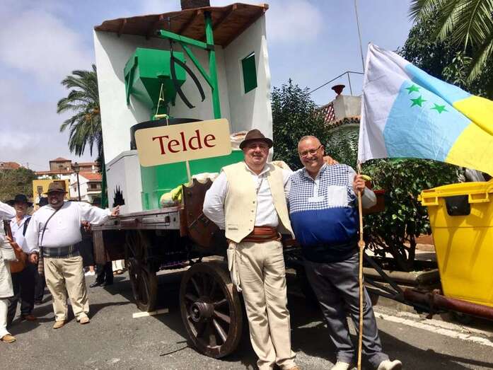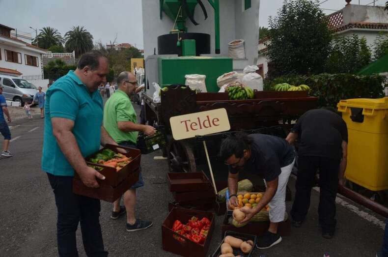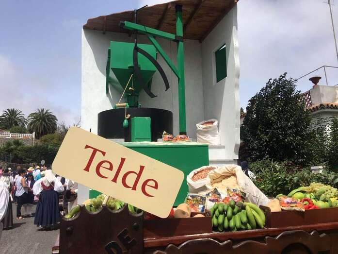 A las 17.53 horas, los niños teldenses David Santana y Lucía Santana recitaban unas décimas a escasos metros del trono de la patrona de la Diócesis de Canarias y pocos después las autoridades brindaban la ofrenda de los más de 200 kilos de frutas, verduras y gofio transportados en la carreta del municipio que participó en octavo lugar, dedicada este año a la tradición molinera de la ciudad y, en especial, al último ingenio de esta índole que cerró en Lomo Magullo, el molino de Los Lozano, con una réplica en escala de este artilugio diseñada y elaborada por trabajadores municipales con madera, principalmente.
