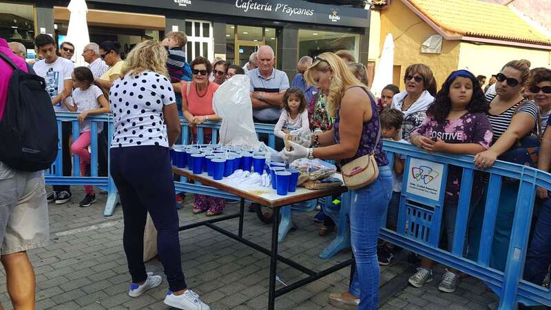 En vasos de plástico, y aderezadas con un puño de gofio –tostado y molido a muy pocos metros de la plaza de Los Llanos, en las instalaciones del histórico Molino de Fuego, uno de los pocos que aún se mantienen abiertos en Gran Canaria–, las dosis de leche fueron desapareciendo casi por arte de magia entre los asistentes. Hasta mediodía se extendió el reparto.