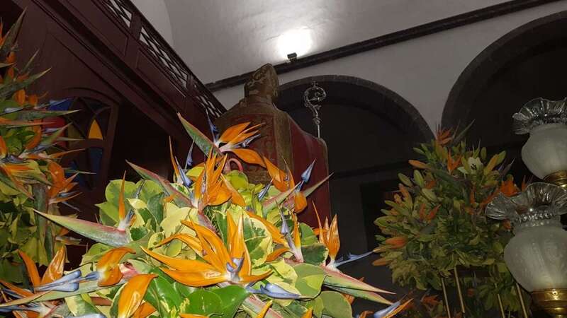 El trono estaba bellamente engalanado con una cuidada ornamentación floral que combinaba 500 ejemplares de esterlicias, 400 lirios, orquídeas y antulios.