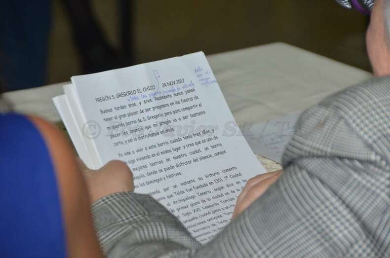 La pregonera, que fue presentada por Lidia Mejías, abogada y presidenta del colectivo vecinal Los Llanos de San Gregorio, organizador de estos festejos de tres días de duración, arrancó hablando de la fundación de Telde, en las postrimerías del siglo XVI, de la descripción que hizo el ingeniero cremonés Leonardo Torriani de ella a mediados del siglo XVI y finalizó refiriéndose al callejero de El Cascajo y a la figura de Juan García Suárez El Corredera, vecino de la zona y opositor al régimen franquista que fue ejecutado con el método del garrote vil en 1959.