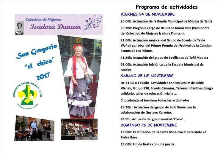 De 11.00 a 13.00 horas: Actividades con los scouts de Telde Wañak y el grupo 130 de los Scouts Canarias. Habrá talleres infantiles, bingo solidario, taller de Educación Vial, etcétera. Se servirá una chocolatada al terminar todas las actividades.