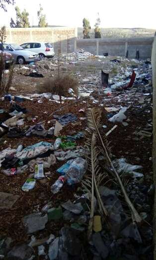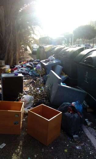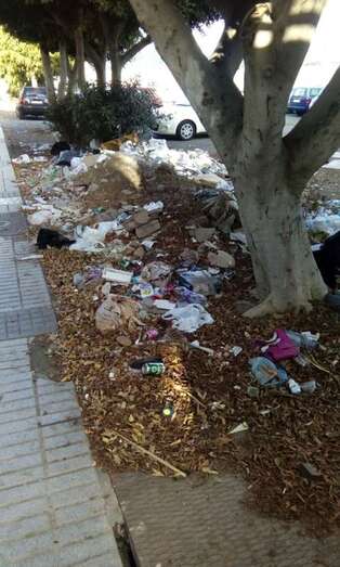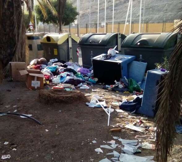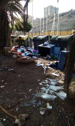 Este pequeño vertedero clandestino se encuentra en un parterre de la zona de El Dorado, tras uno de los puntos de contenerización del servicio de recogida de residuos. Entre hojas secas de palmera y demás vegetación inerte, se esparcen las basuras, sofás, muebles, cristales rotos, latas, envases y todo tipo de desperdicios. Incluidas piezas de coches.