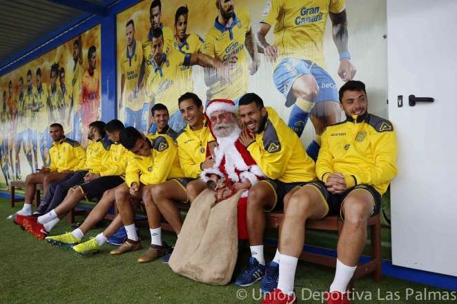 Santa acudió a las instalaciones de El Hornillo para visitar a la plantilla de la Unión Deportiva Las Palmas, que provisionalmente utiliza desde hace meses este complejo deportivo teldense para sus entrenamientos.