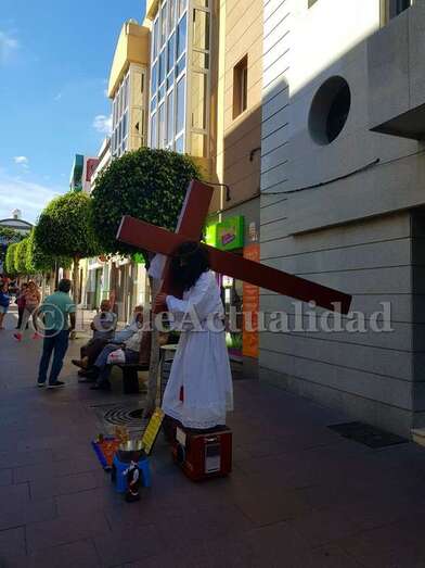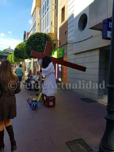 Se trata de una perfomance de un nombre vestido con una túnica blanca, barba poblada y larga cabellera que subido a una pequeña tarima porta a cuesta una cruz asemejando a Jesucristo de Nazaret. Ha sido el atractivo de esta mañana en la calle peatonal principal de Los Llanos.