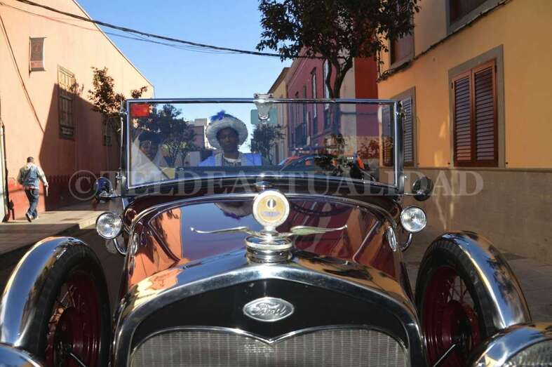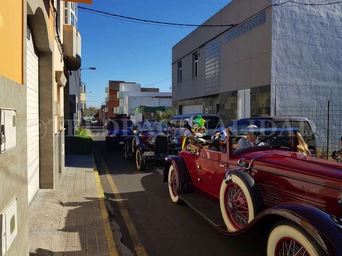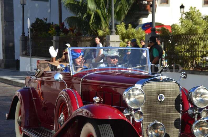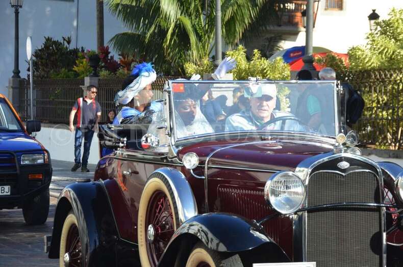 Sin apenas tiempo que perder, arribaron sobre las 10.00 horas a la sede de la Concejalía de Festejos del Ayuntamiento de Telde, en la calle Conde de la Vega Grande de San Juan, para recoger un cargamento de caramelos y reunirse con el concejal Juan Martel de cara a terminar de perfilar los detalles de su estancia en la ciudad. Veinticuatro horas frenéticas que comenzaron minutos después con un recorrido en coches antiguos por los cinco distritos de la ciudad.