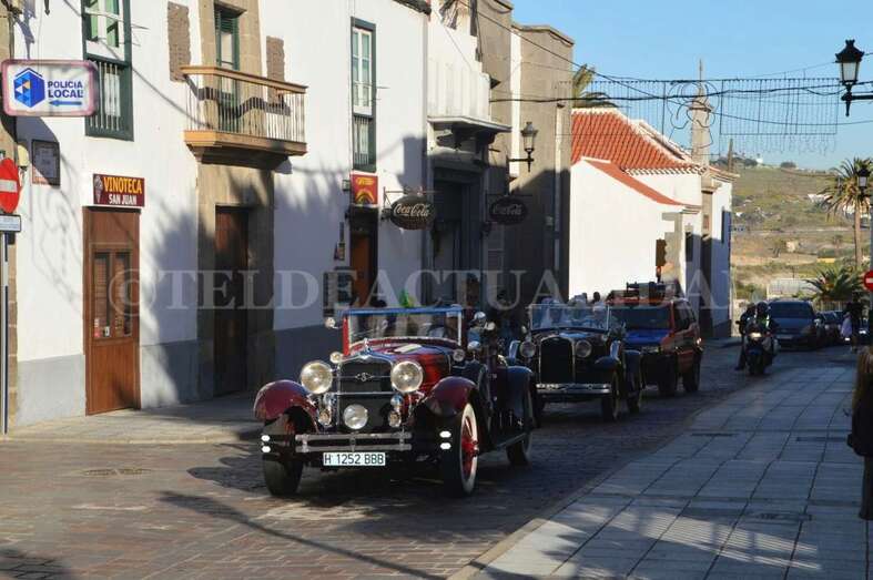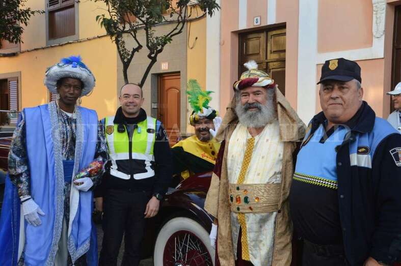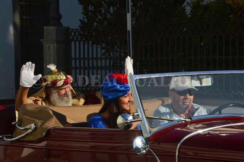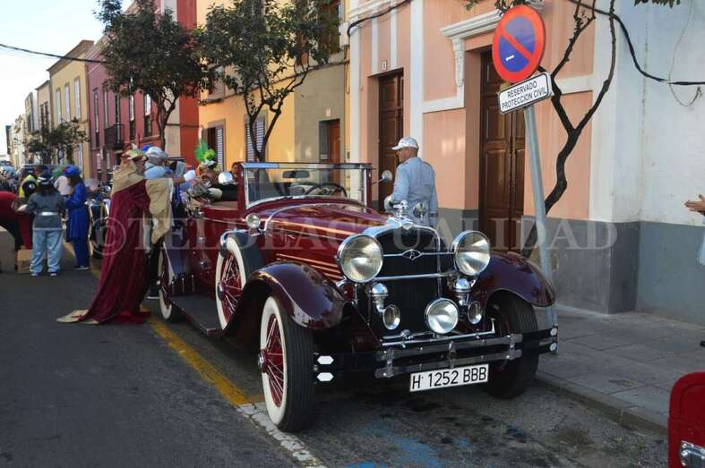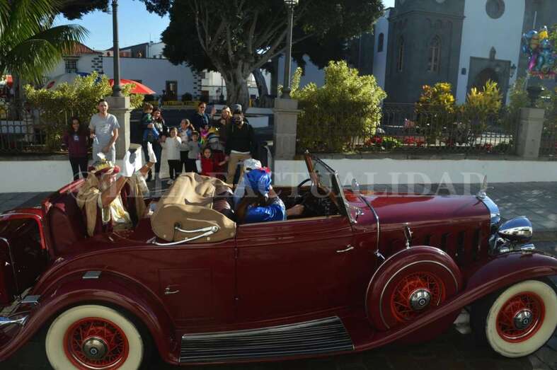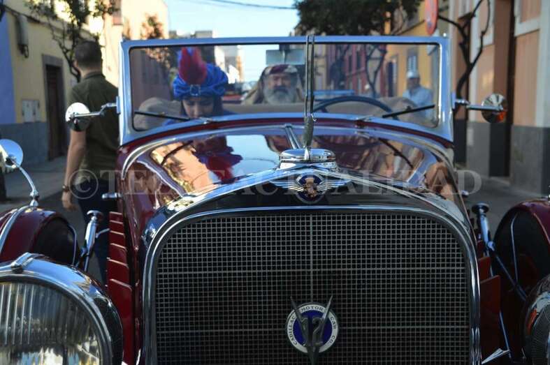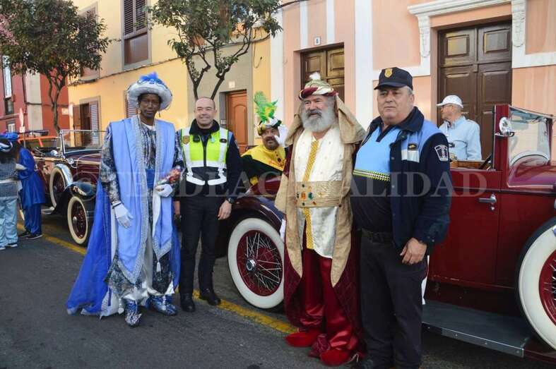 Montados junto a sus pajes en tres coches americanos de época –un Cadillac, un Ford y un Stutz– y escoltados por un dispositivo especial de la Policía Local y de Protección Civil que anunciaba su llegada con un soniquete de sirenas, Melchor, Gaspar y Baltasar se pusieron en marcha para visitar buena parte de los barrios de Telde, desde la costa a zonas de cumbre como Lomo Magullo.