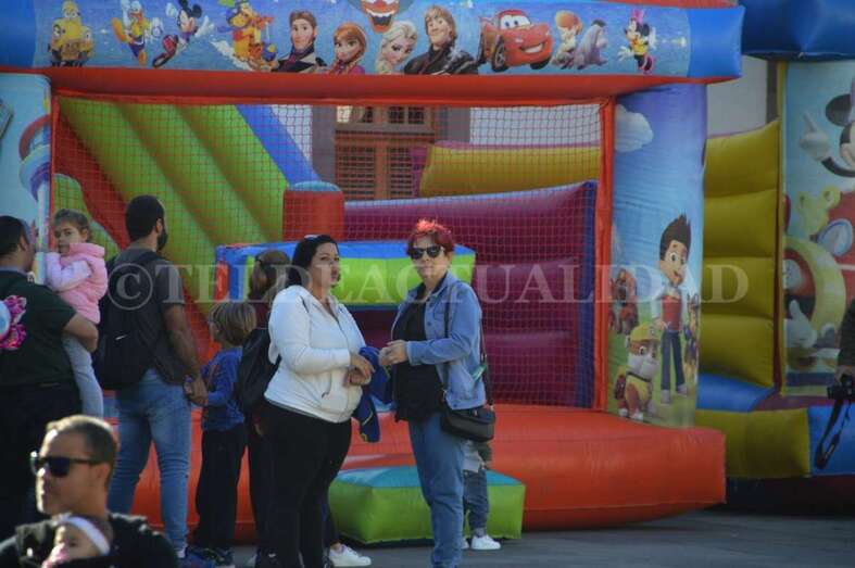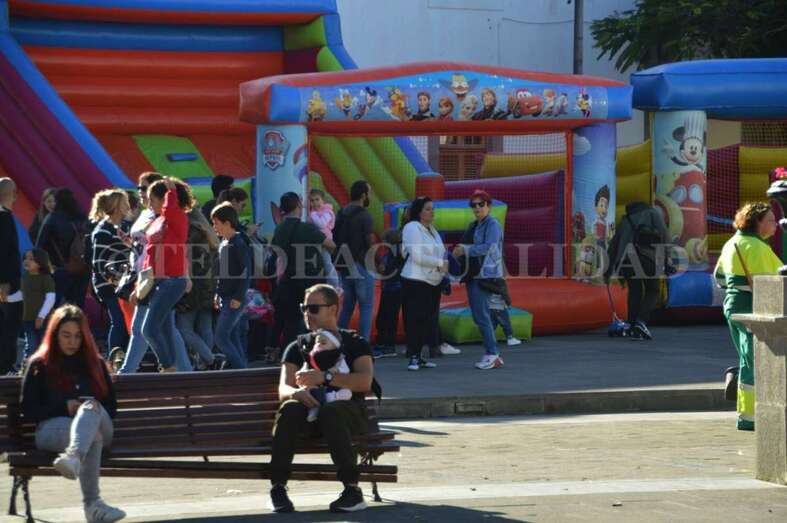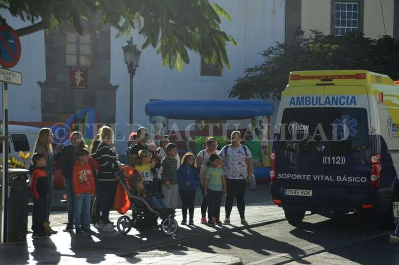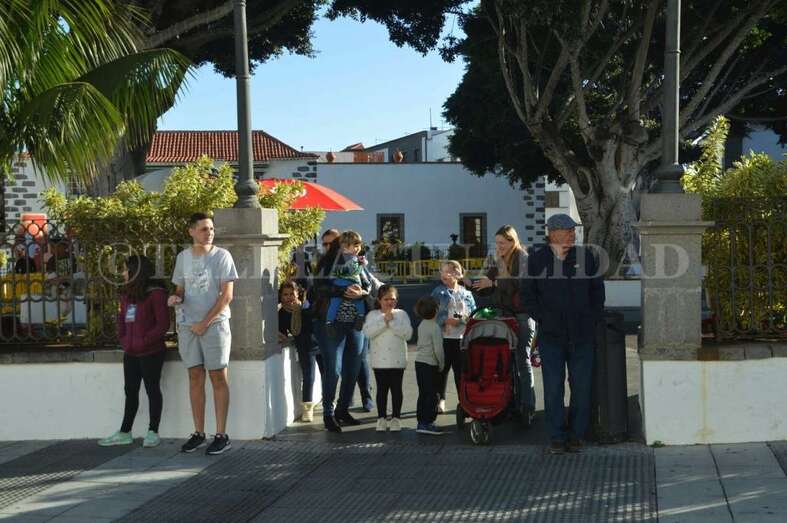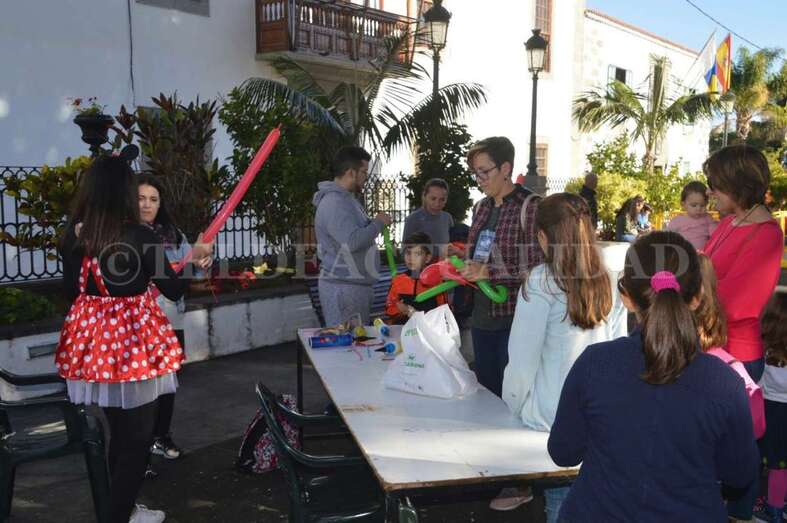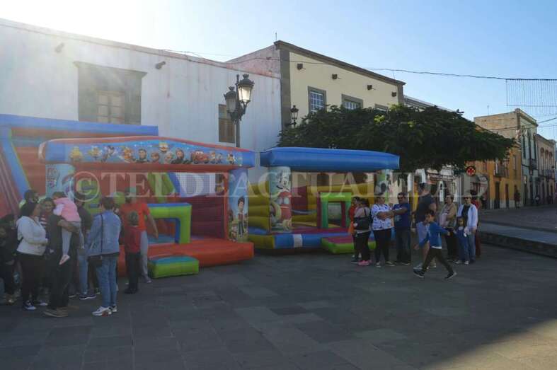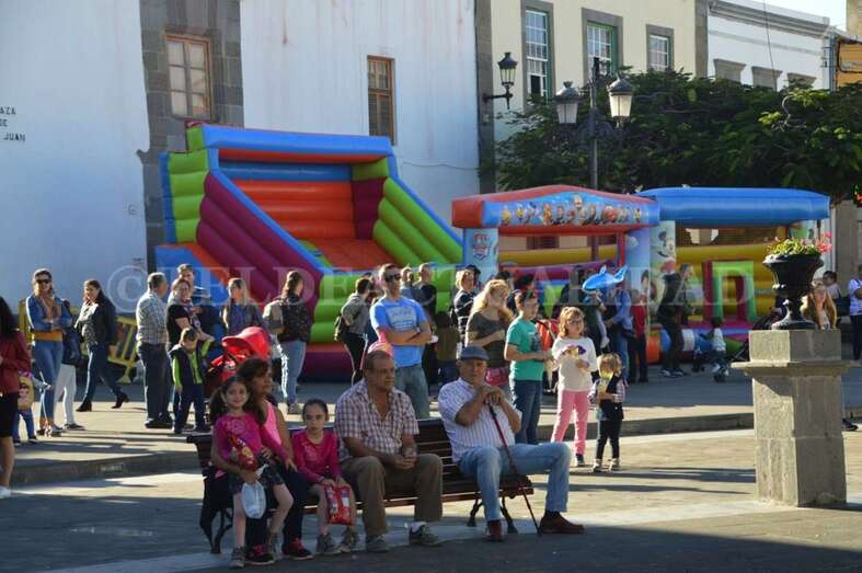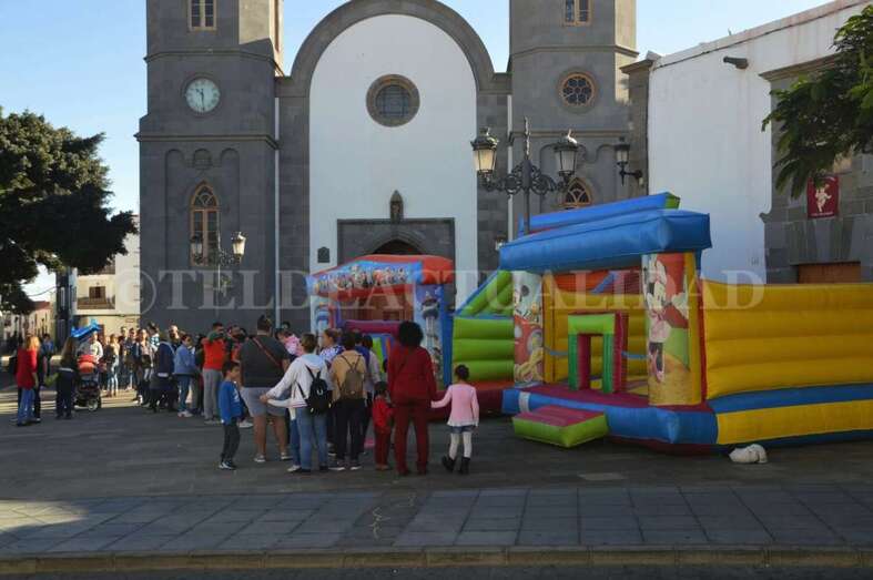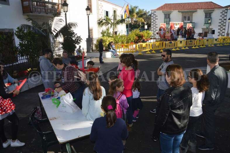 Tras este recorrido motorizado, arribaron a mediodía a San Juan a bordo de un coche de bomberos antiguo, un elegante vehículo de coleccionista de data de principios del siglo pasado, de 1927. La Corporación local los recibió en la plaza, en donde la muchedumbre ya se agolpaba desde una hora antes. Los cientos de menores que acudieron al encuentro de los Reyes Magos disfrutaron de toda una serie de actividades con las que hacer más amena y corta la espera. Zancudos, malabaristas, talleres, pintacaras, colchonetas hinchables, un fotomatón y un show infantil que hicieron las delicias de los más pequeños de la casa y aplacaron el nerviosismo que se palpaba.