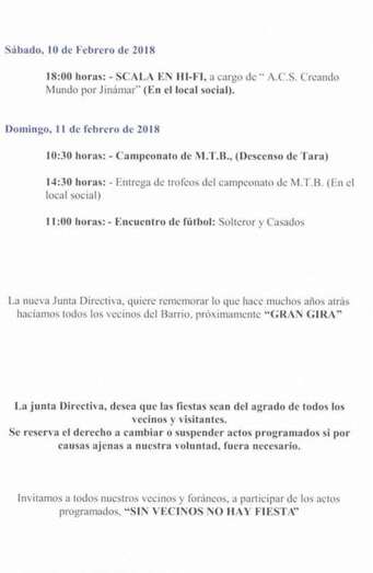La última jornada festiva será la del domingo 11 de febrero, día en que se celebrará el campeonato de MTB (10.30 horas) y, casi de manera simultánea, el partido de fútbol entre solteros y casados del barrio (11.00 horas).
